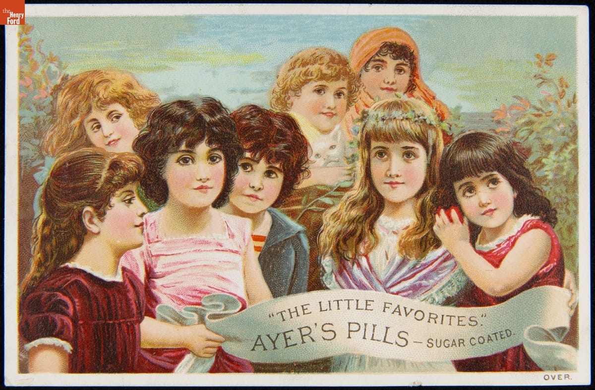James C. Ayer (1818-1878), a purveyor of patent medicines in the 19th century, claimed his treatments could cure colds, coughs, and other ailments, purify the blood, and invigorate the hair. Ayer--and later his company--successfully marketed his products by printing thousands of trade cards, almanacs, and newspaper and magazine ads. Ayer's company continued production well into the 20th century.
