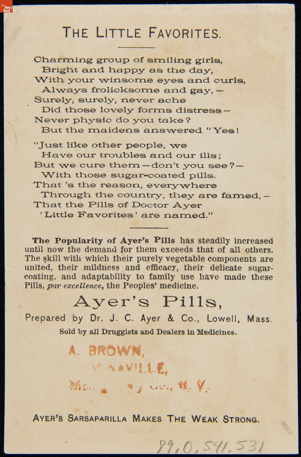 Trade Card for Ayer's Sugar Coated Pills, "The Little Favorites," 1880-1900