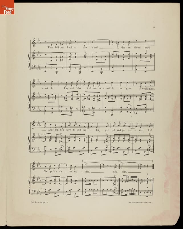 Early automobiles were often unreliable and needed frequent maintenance. Some motorists were able to make roadside repairs--preparing themselves for inevitable breakdowns by carrying tools and supplies. In this song a faulty engine interrupts a young couple's romantic intentions.
