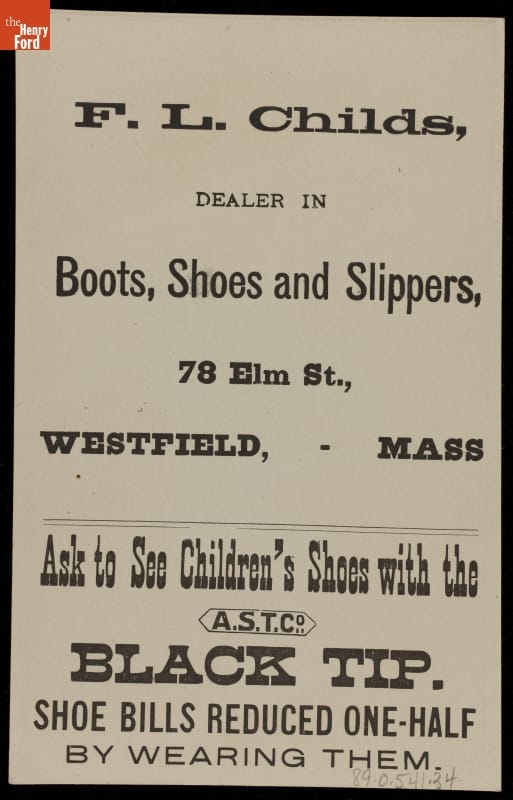 Advertisied product manufactured by American Shoe Tip Co. Boston, Massachusetts, sold by F. L. Childs, Westfield, Massachusetts. Card printed by Donaldson Brothers, Five Points, New York.