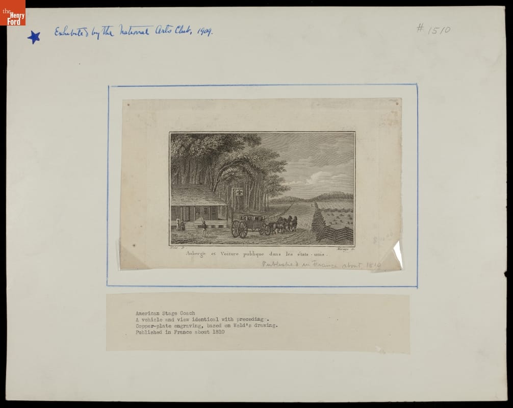 Description beneath: American Stage coach. A vehicle and view identical with preceding. Copperplate engraving based on Weld's drawing. Published in France about 1810. Exhibited by the National Arts Club, 1909.