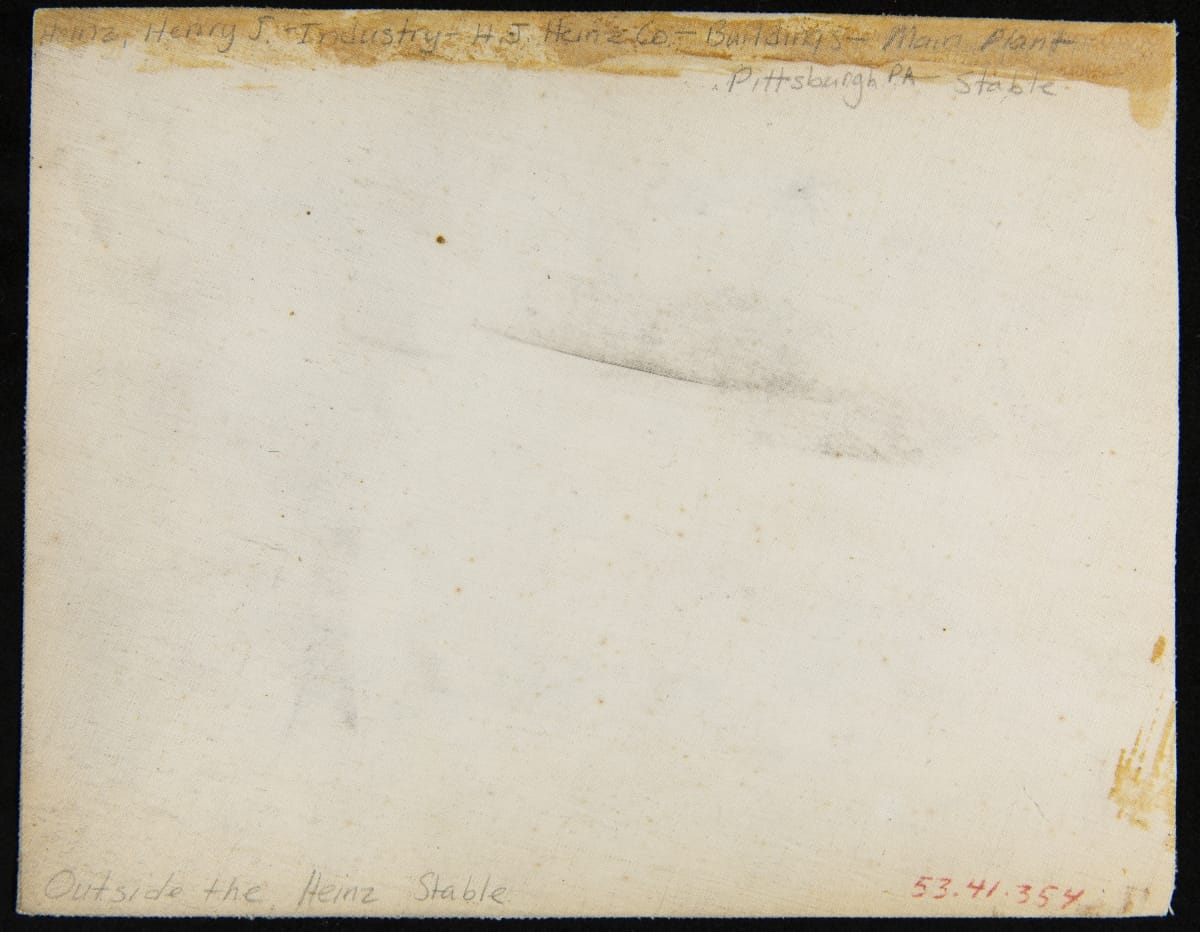The main plant of the H.J. Heinz Company was located in Pittsburgh, Pennsylvania, and consisted of many buildings and departments. The buildings in the background of this photograph are the Preserves Building (left) and the stables (right). The top-of-the-line stables -- sometimes referred to as "equine palaces" -- housed the company's horses, which were used for delivery and transportation.