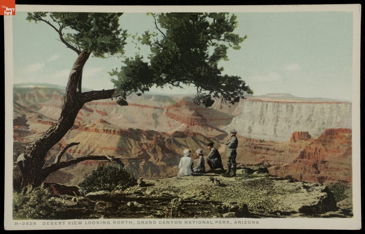 This postcard shows a group of tourists relaxing at the Grand Canyon National Park in Arizona. Scenic postcards became a way to remember vacations or to tell others about travel experiences.