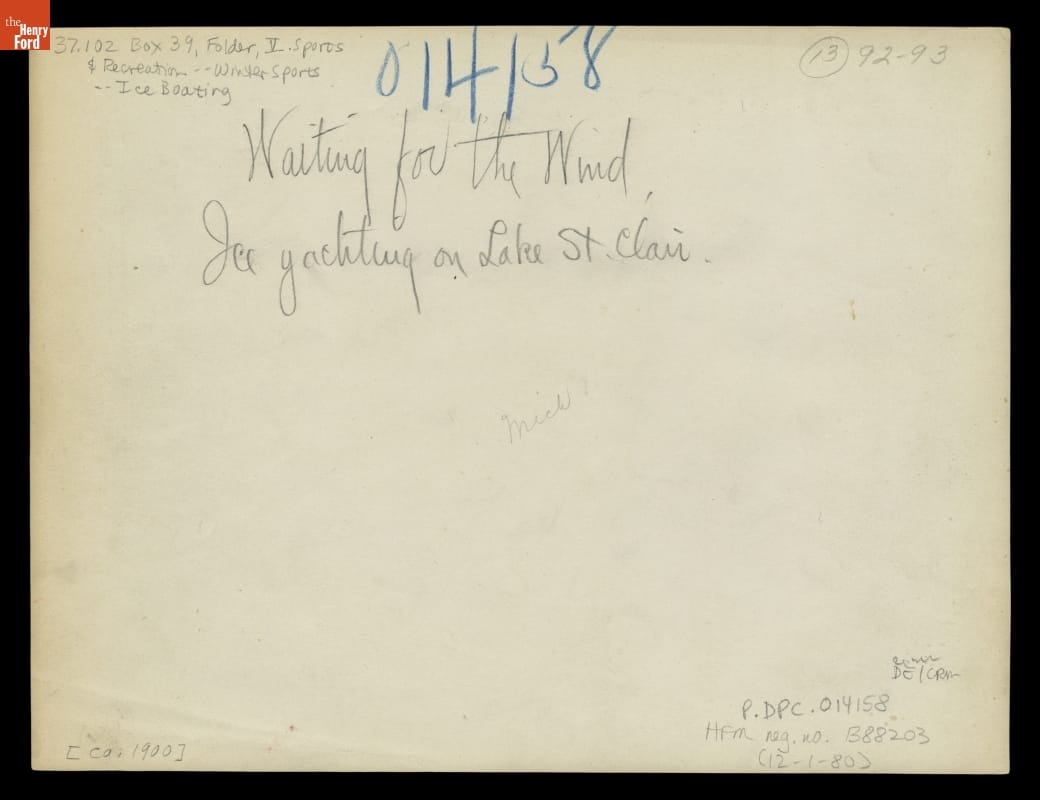 Written in pencil on verso: Waiting for the Wind. Ice yachting on Lake St. Clair