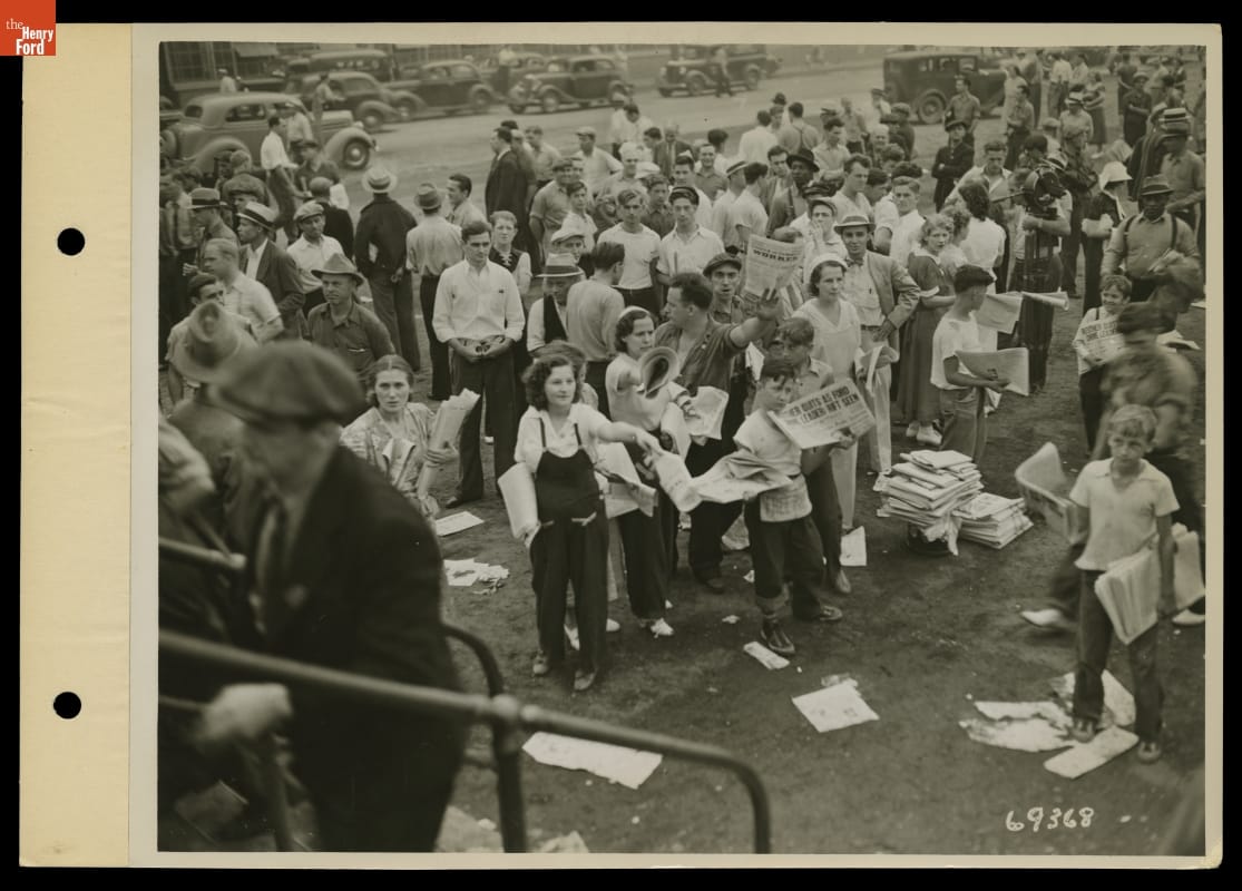 The image shows continuing United Auto Workers activity outside the Ford Rouge plant less than three months following the "Battle of the Overpass," in which Ford Motor Company security men beat labor organizers Walter Reuther, Richard Frankensteen, Richard Merriweather, and Ralph Dunham. Men and women hand out special editions of the United Auto Worker UAW newspaper while boys sell Detroit Free Press newspapers.