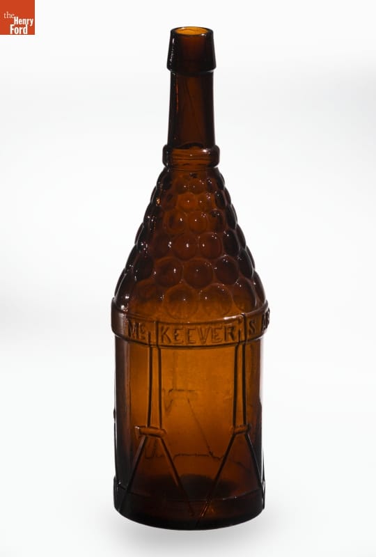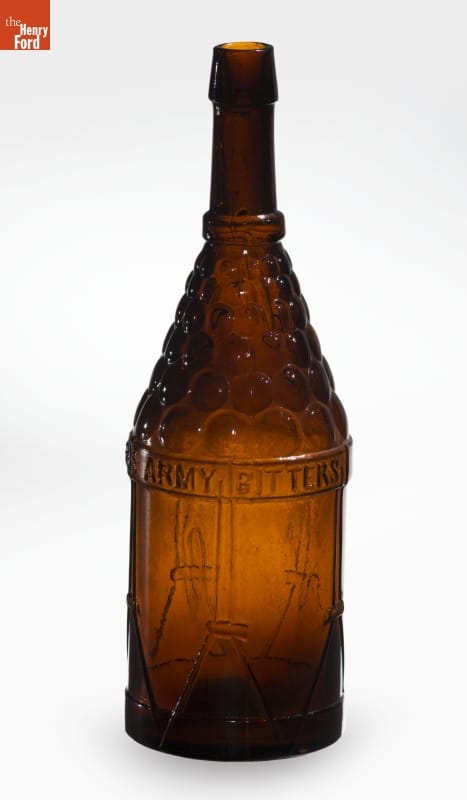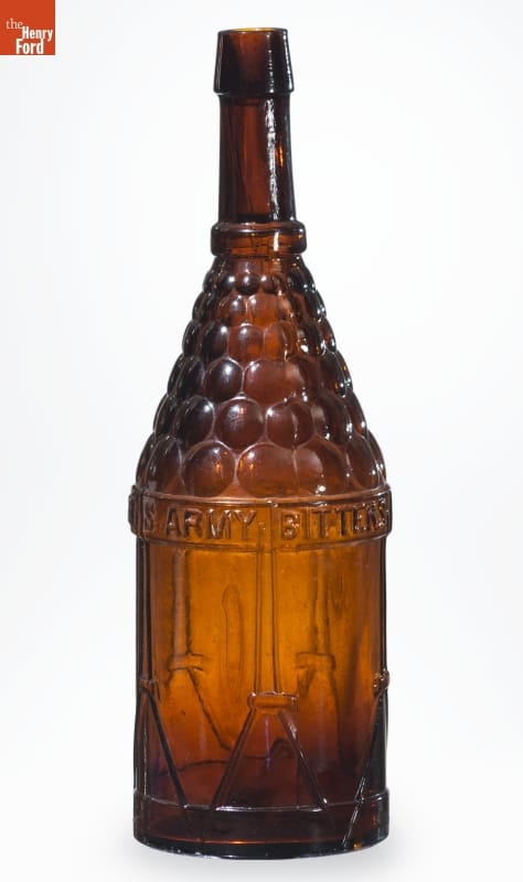 Bitters is an herb-infused alcoholic mixture. Named for its bitter taste, the liquid was originally developed as a medicinal tonic to help soothe stomach complaints or other digestive disorders. During the late 19th and early 20th centuries, patent-medicine dealers bottled and sold the elixir. Americans purchased bitters in simple mold-blown bottles or ones shaped like drums, barrels, or cabins.