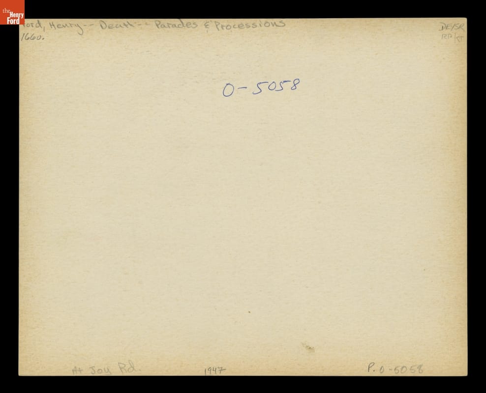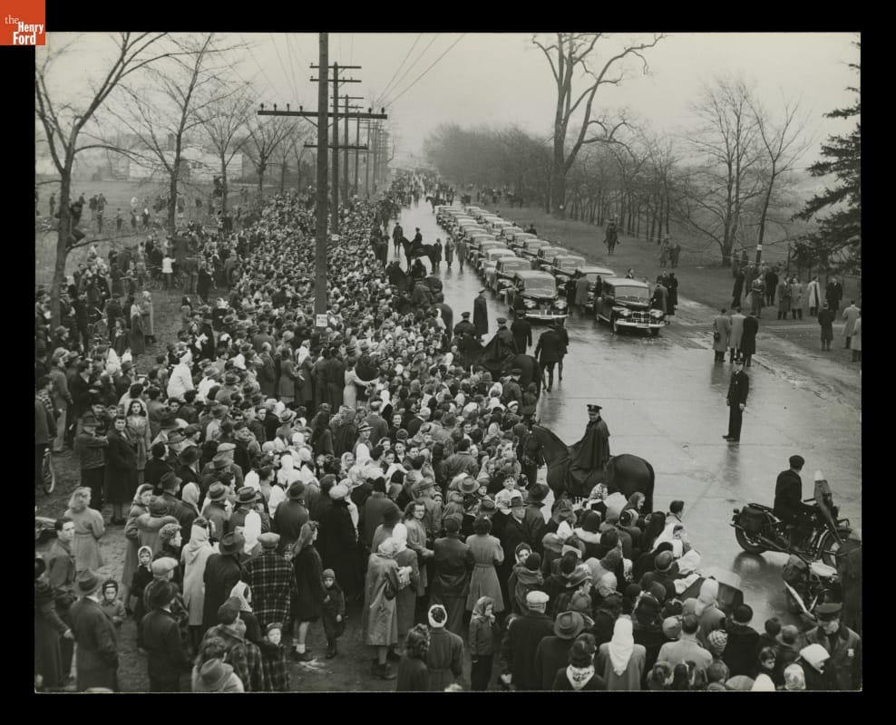 Henry Ford died on April 7, 1947, at his Fair Lane estate in Dearborn, Michigan. Thousands mourned his death. Many waited in a mile-long line to pay their respects when Ford lay in repose at Greenfield Village. This photograph shows the funeral procession and crowds lining the street at Ford Cemetery.