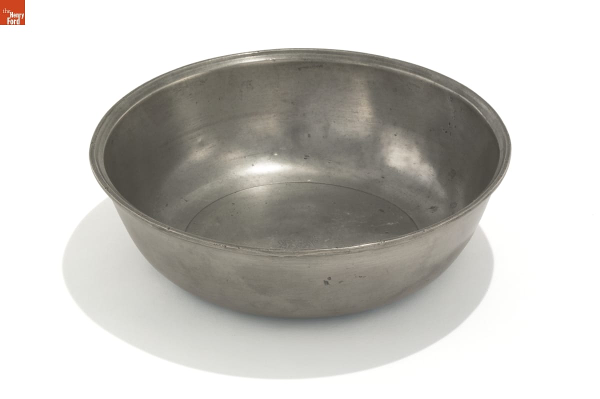Pewter goods could be found in many American homes and public buildings in the late 18th and early 19th centuries. Most Americans of modest means could afford to have pewter spoons, ladles, tankards, dishes, plates or other items. Basins, such as this one, generally held puddings, stews or other semi-liquid foods served at meals.
