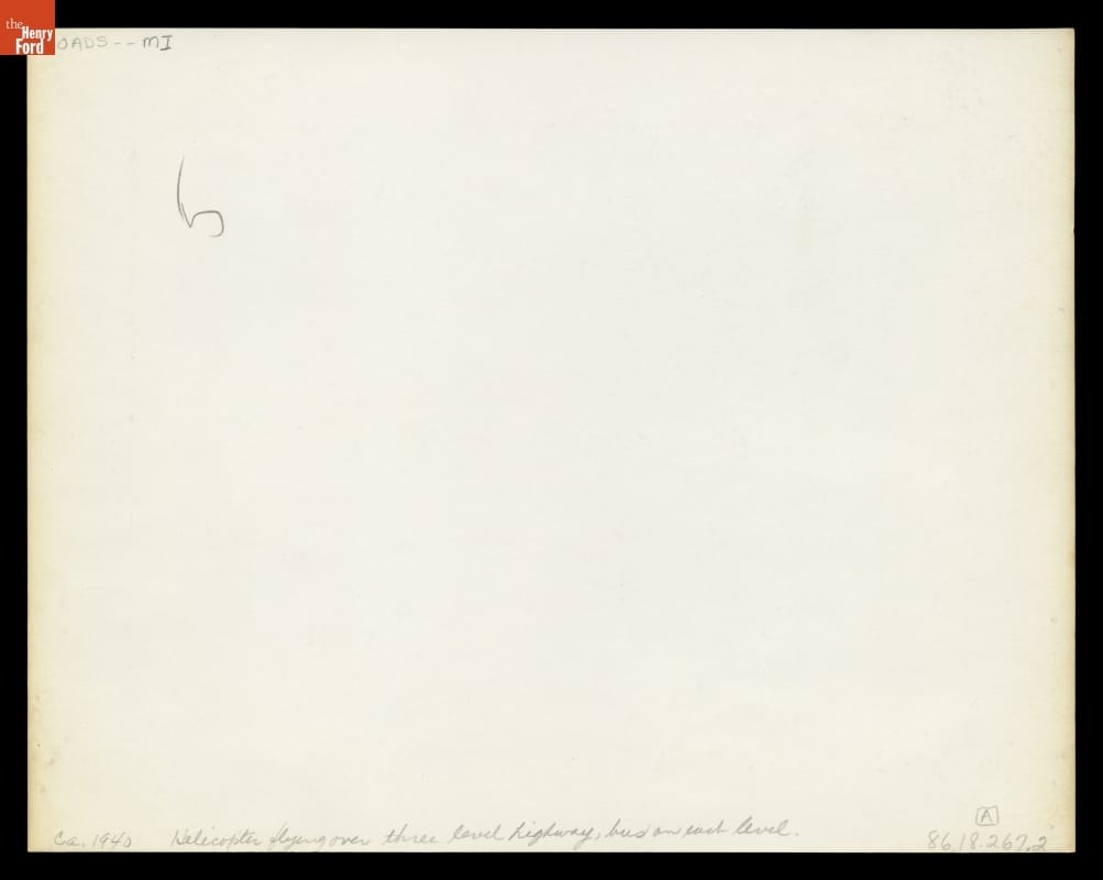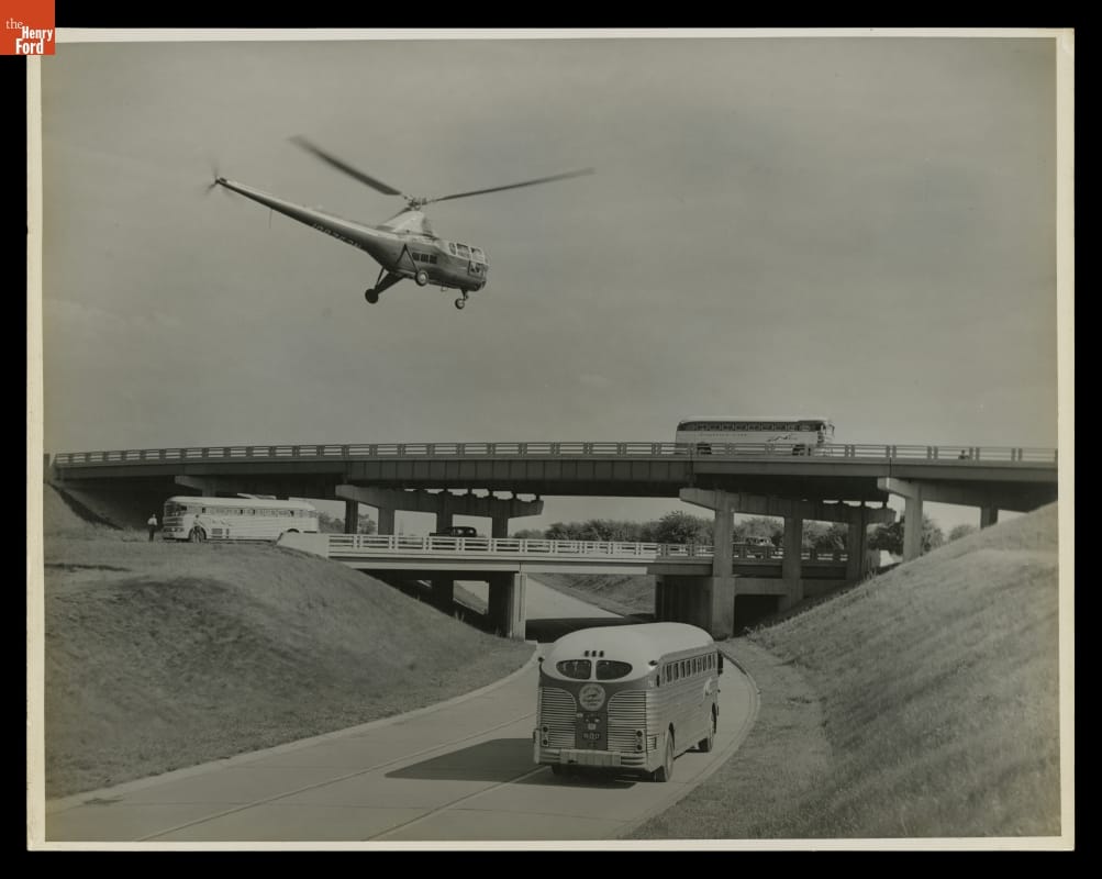 Helicopter Flying over 3-Level Highway, Greyhound Bus on Each Level, circa 1940