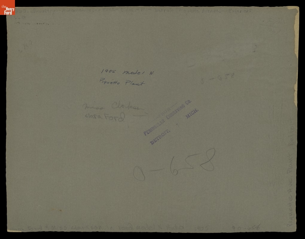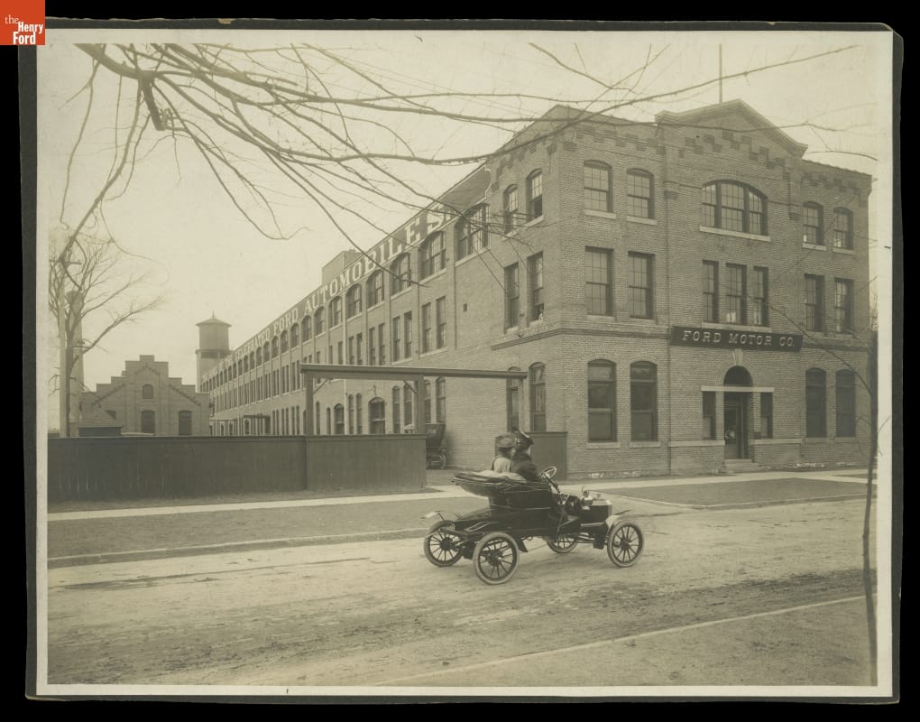 Clara Ford, wife of Henry Ford, and Myrle Clarkson, a secretary at the Ford Piquette Avenue Plant, drive a Model N past the plant. The Model N was the low-priced but smaller predecessor to the Model T. The Model T was designed and first built in this building, at the corner of Piquette Avenue and Beaubien Street in Detroit.