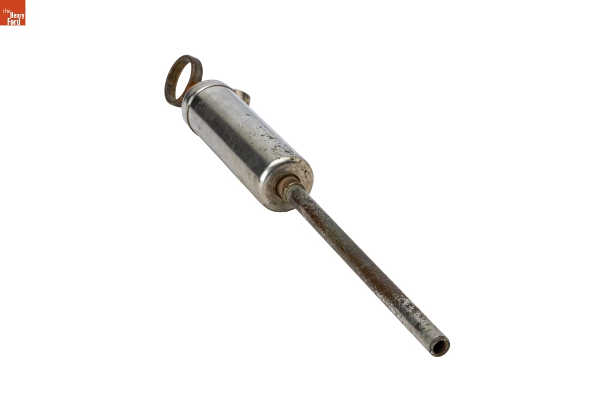 Veterinarians use dose syringes to dispense a specific quantity of medicine. This syringe injects medicine orally into an animal's mouth -- unlike syringes that use a needle to inject medicine intravenously into the bloodstream. Dose syringes like this one, made of metal, were not disposable and had to be sterilized between uses.