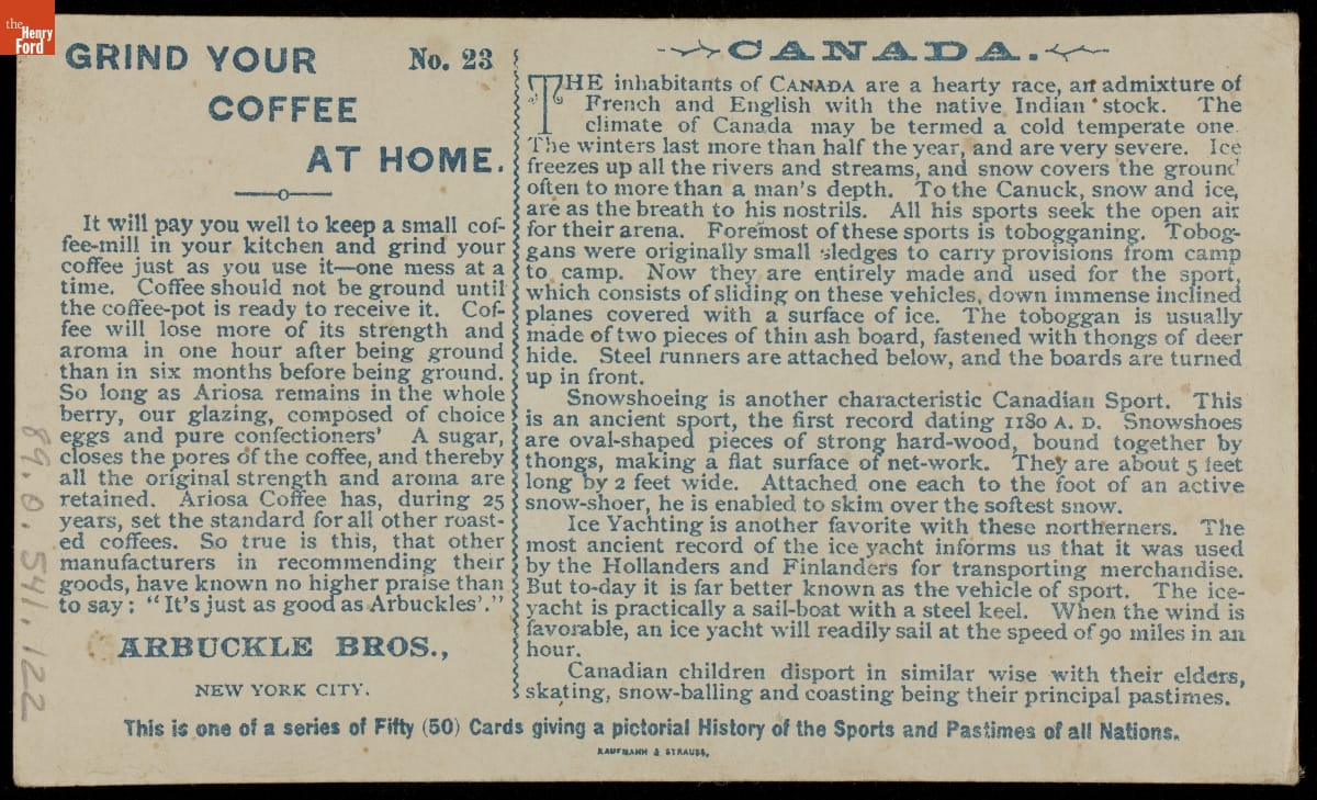 Grocers sold coffee in bulk when John and Charles Arbuckle came up with an innovative process for individually packaging different grades of coffee. Their popular Ariosa coffee beans were glazed with a sugar and egg coating supposedly to improve quality and flavor. This trade card, from the Chicago Columbian Exposition, was in a series depicting different nations' sports and pastimes.