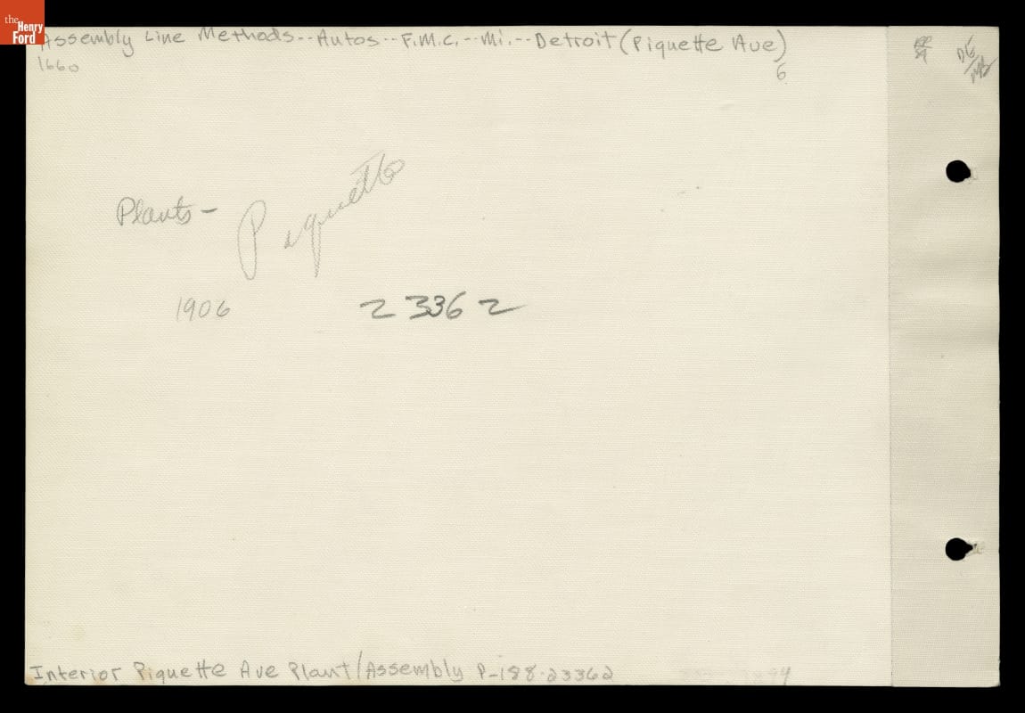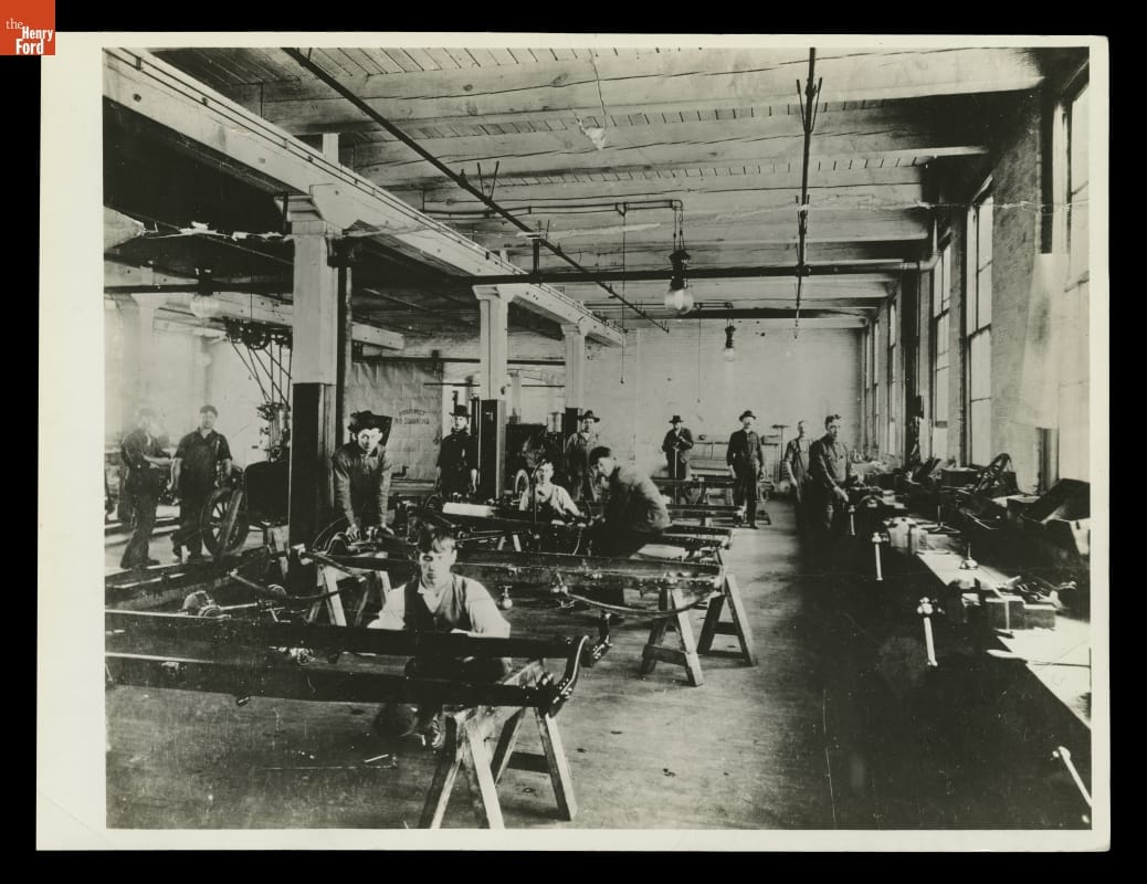 This photograph shows workers at Ford Motor Company's plant on Piquette Avenue in Detroit. No one had yet conceived of the moving assembly line, so crews moved from vehicle to vehicle.