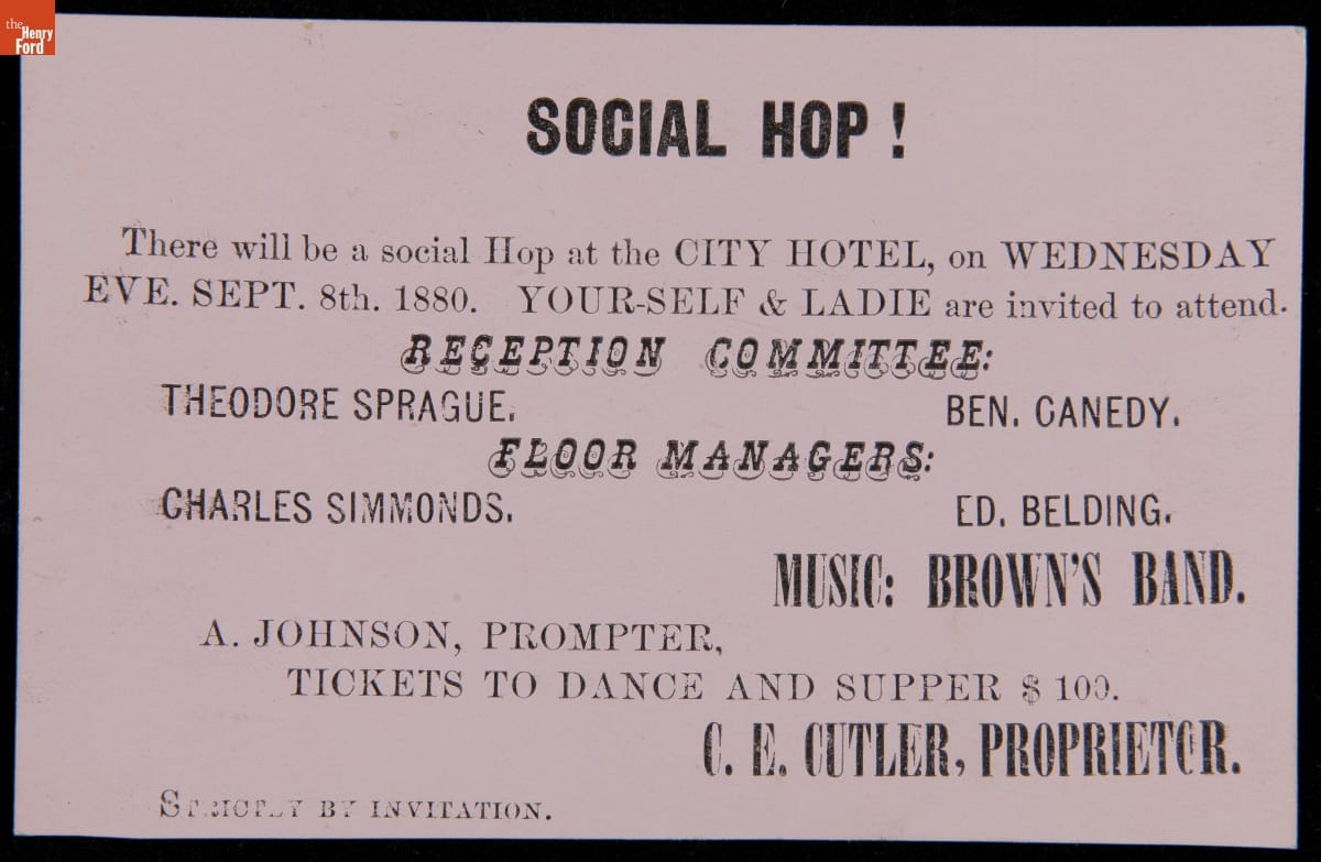 Card Advertising a Dinner Dance at the City Hotel, "Social Hop!," 1880