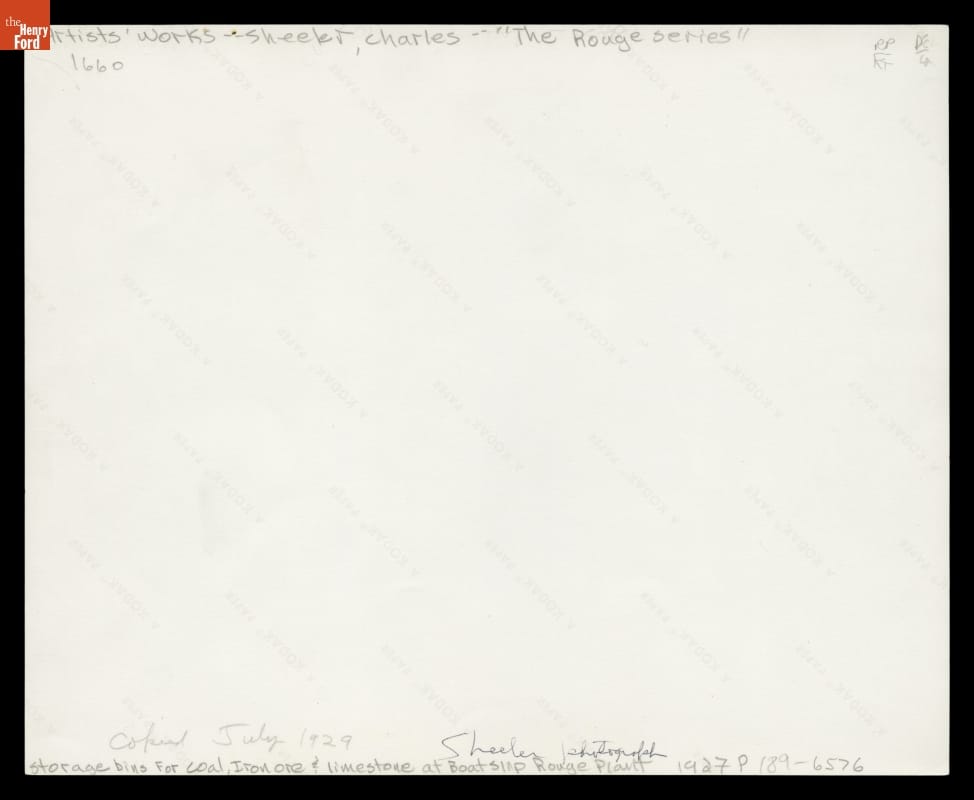Sheeler took more than thirty-two photographs. Of the prints he developed, one group went to Ford Motor Company. Of these, only twelve 8 x 10 inch copy negatives were made by the company in 1929 from the original photographs. The company used these images for the covers of their magazine, Ford News between 1929 and 1930. Today, these 1929 contact prints are part of the collections of The Henry Ford.