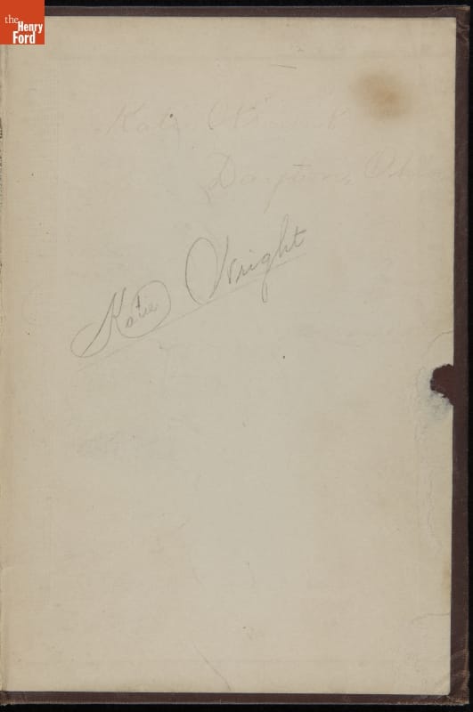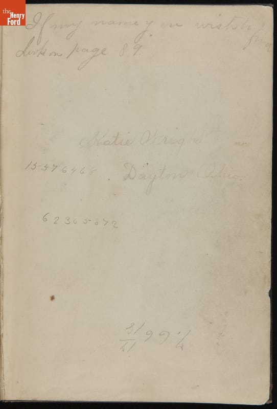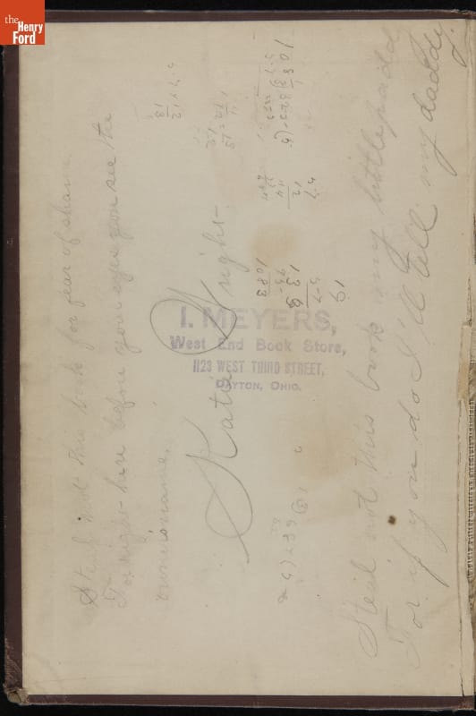 handwritten in pencil inside front cover: Steal not this book for fear of shame / For right here before your eyes you see the / owner's name / Katie Wright handwritten in pencil inside front cover: Steal not this book, my little paddy / For if you do I'll tell my daddy. handwritten in pencil on first page: If my name you wish to find / Look on page 89 / Katie Wright / Dayton, Ohio. stamped in purple ink inside front cover: I. MEYERS, / West End Book Store, / 1123 WEST THIRD STREET, / DAYTON, OHIO.