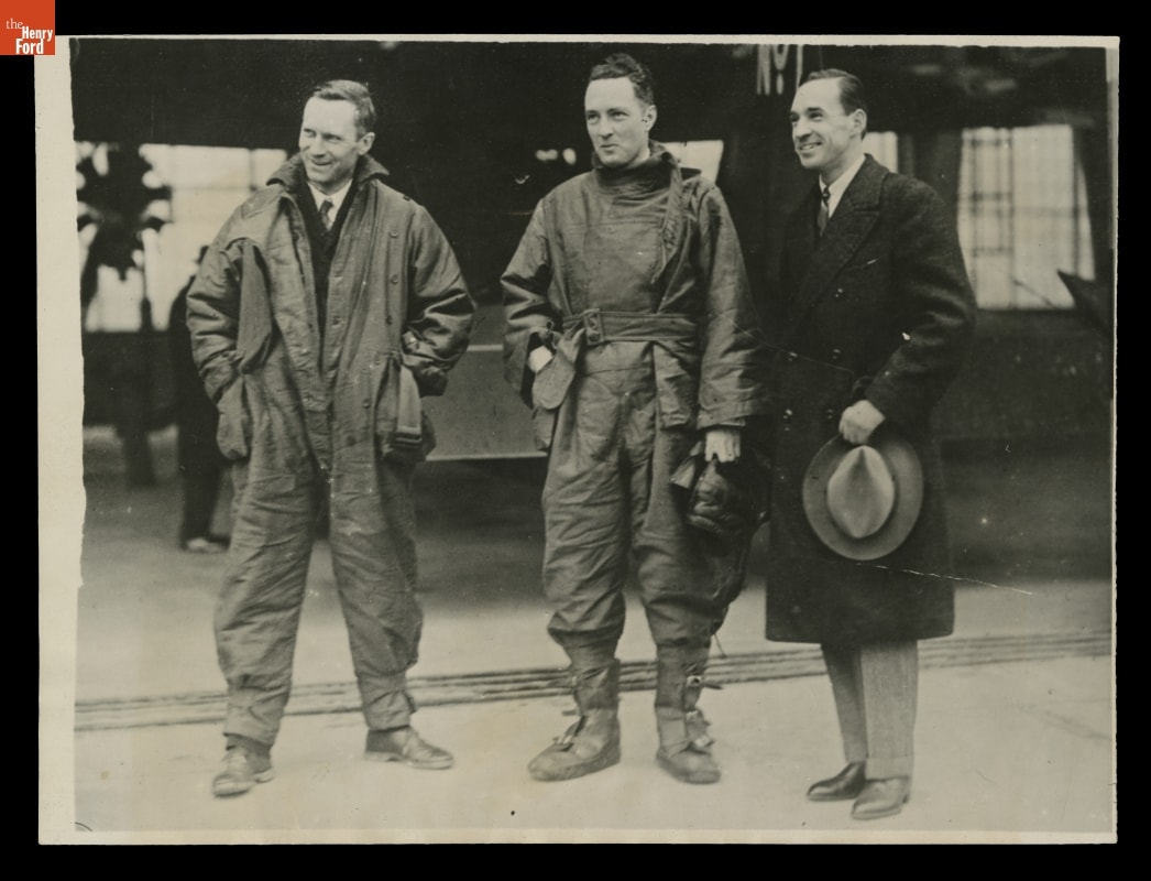 Aviator Floyd Bennett and Explorer Richard Byrd with Edsel Ford at Ford Airport, Dearborn, Michigan, 1926