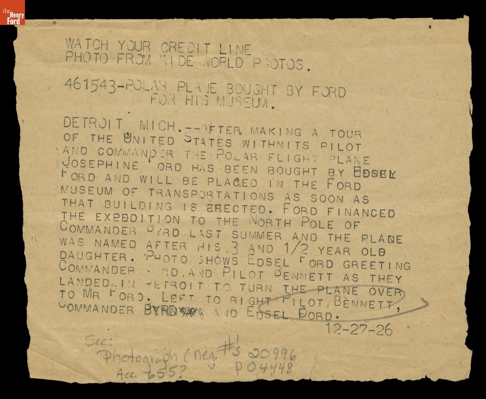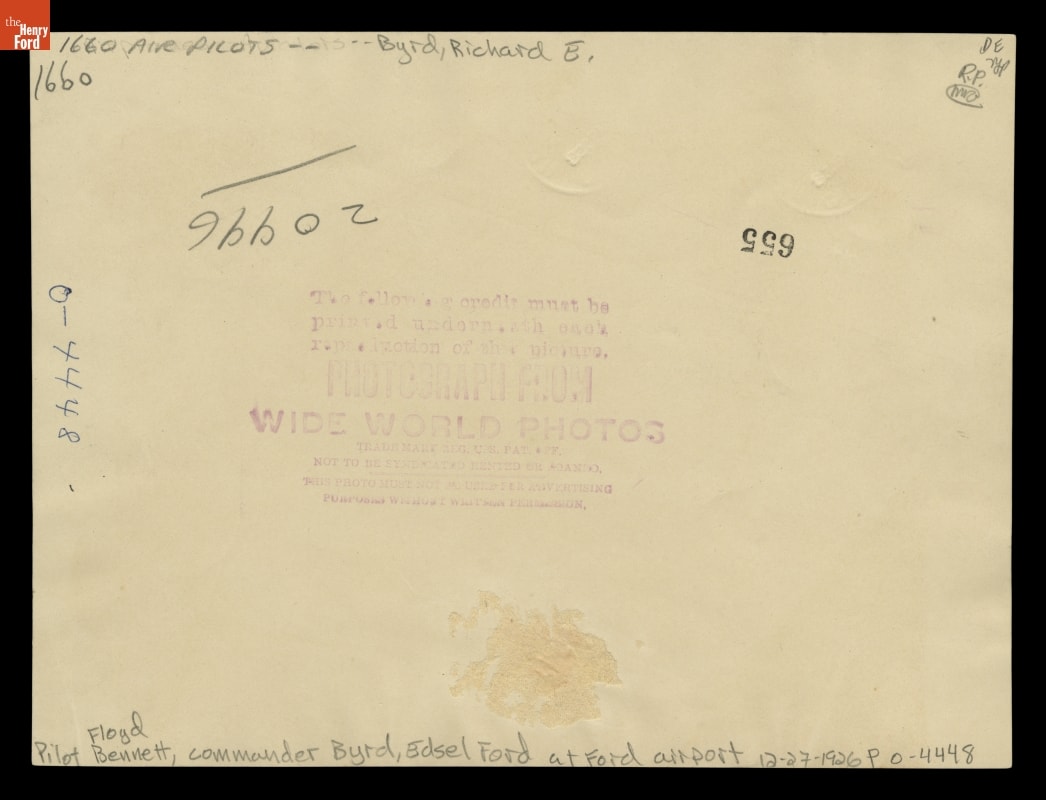When Richard Byrd proposed a flight over the North Pole with pilot Floyd Bennett, he turned to Edsel Ford for financial support. Not only did Ford provide considerable aid himself, he encouraged other business leaders to contribute as well. Following Byrd's flight, he wrote to Edsel Ford: "I owe more to you than all the rest put together."