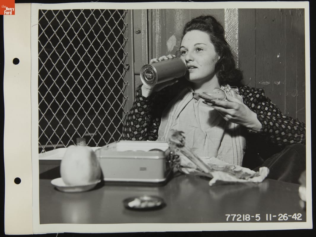 Ford Motor Company Employee Eats Thanksgiving Dinner on the Job at the Highland Park Plant, November 1942