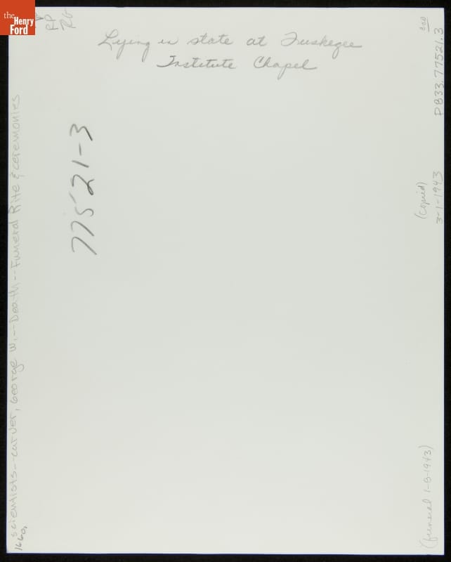 George Washington Carver's funeral services were held at the chapel of the Tuskegee Institute in Tuskegee, Alabama, where the celebrated agricultural scientist had taught since 1896. Carver's death in 1943 provoked an outpouring of tributes to his remarkable life and work.