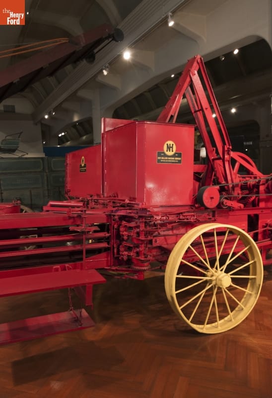 This tractor-drawn baler changed the way farmers made hay. Before pick-up balers, farmers hauled hay to the stationary baler. This baler went to the hayfield where it picked up cured grass, pressed it into rectangular bales, and automatically tied the compressed grasses into a hay bale. Farmers could pick up and move these bales, and they had a higher market value as fresh hay.