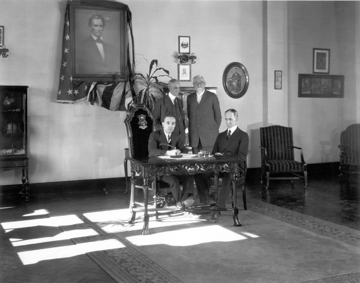 Henry Ford, Henry Leland, Edsel Ford, and Wilfred Leland at the Acquisition of Lincoln Motor Co. by Ford Motor Co., 1922