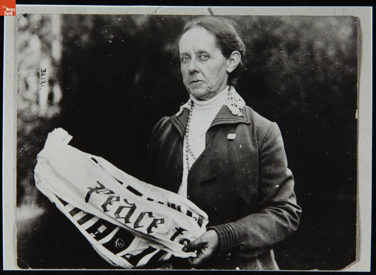Suffragist Alice Locke Park Holds a Peace Flag, 1916