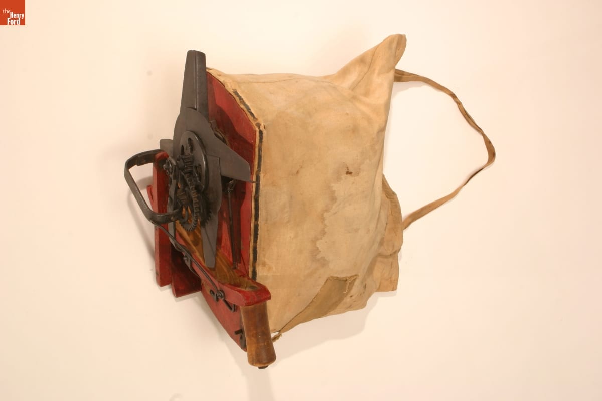 The hand-cranked spinning disk of a broadcast seeder distributes grass and grain seed quickly to a wide area -- an improvement over tossing out seed by hand. By the time this seeder was made, it would have been used on smaller farms or to plant less critical crops. Larger, wealthier farms employed seed drills, which placed the seed into the ground.
