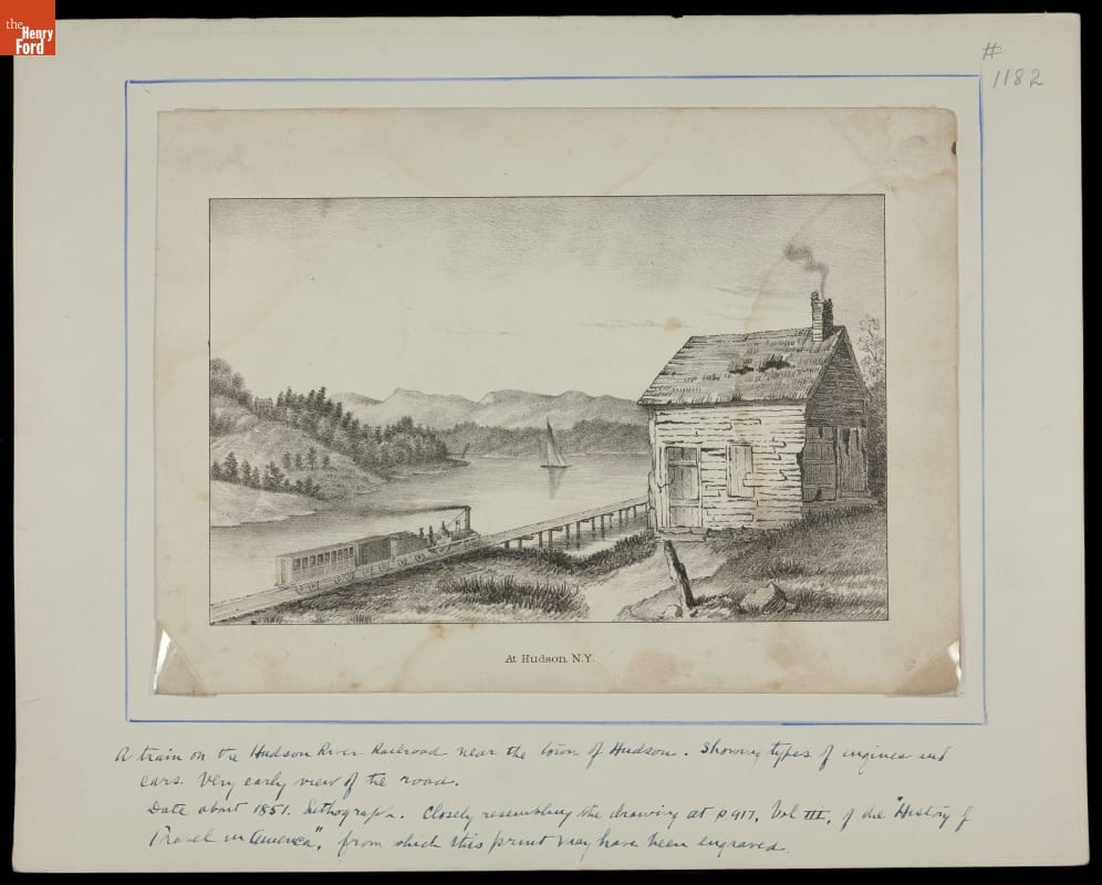 The Hudson River Railroad was chartered in 1846, and the full line was completed in 1851. This 1850s engraving depicts a train with baggage and passenger cars near the town of Hudson, New York, traveling the tracks that parallel the Hudson River.