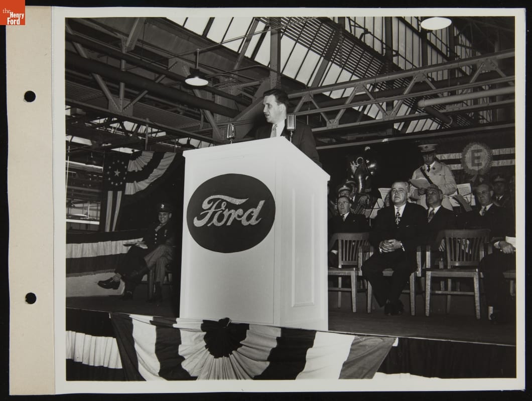 Ford Motor Company president Henry Ford II addressed employees and officials at the automaker's Twin Cities Assembly Plant in St. Paul, Minnesota, after the plant received an Army-Navy "E" Award. The prize honored factories that excelled in the production of war materiel and maintained exceptional labor relations during World War II. Only a small percentage of manufacturers earned the award.