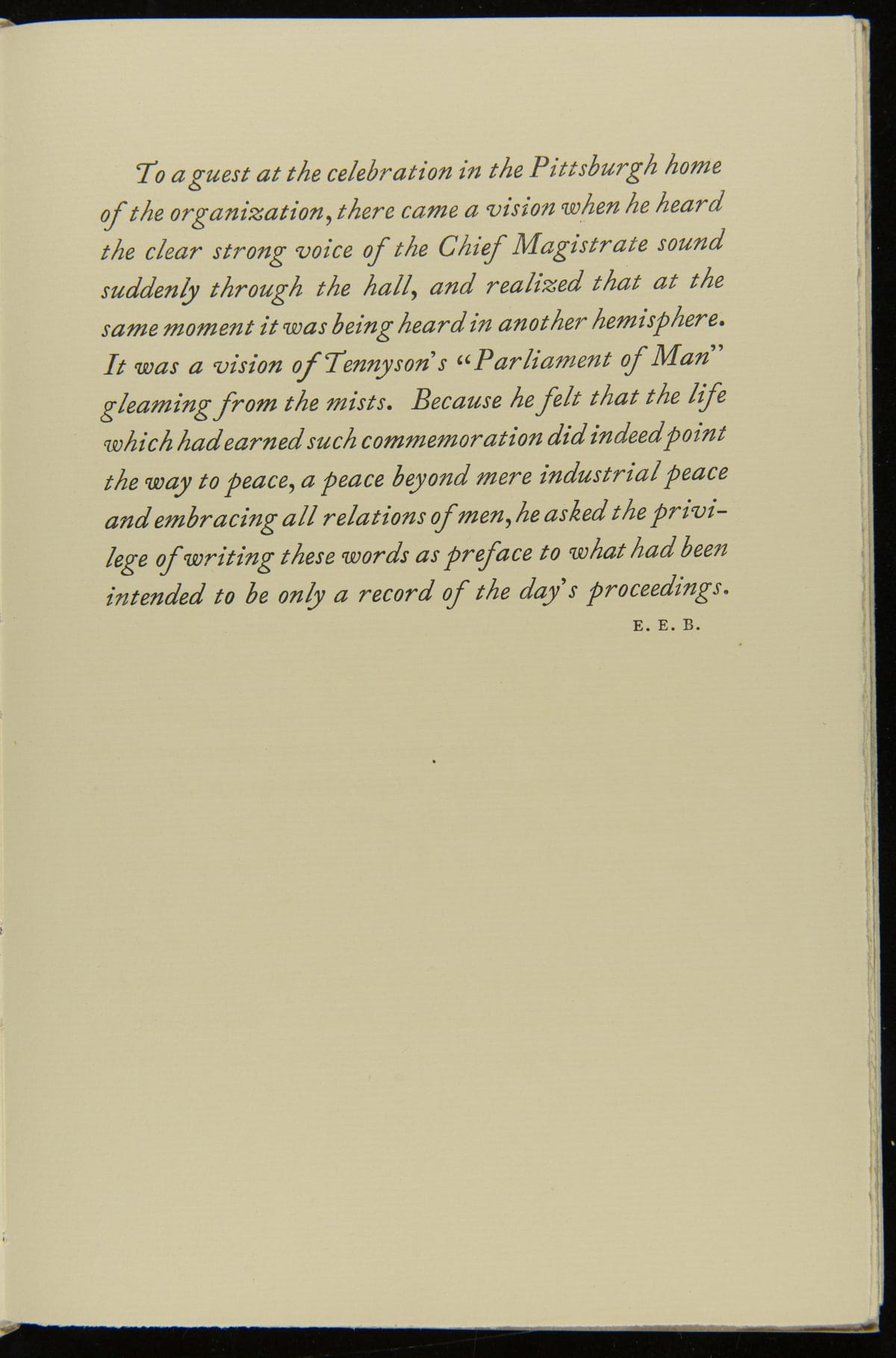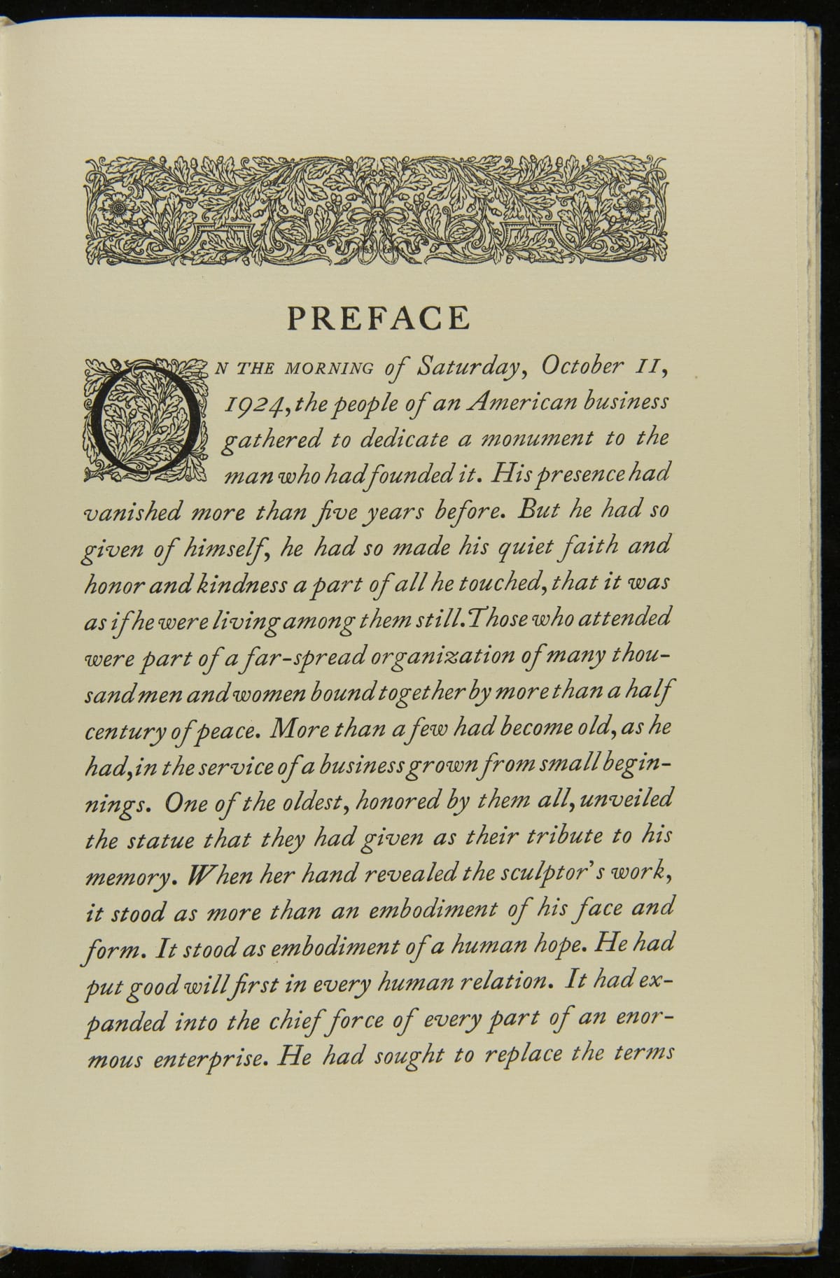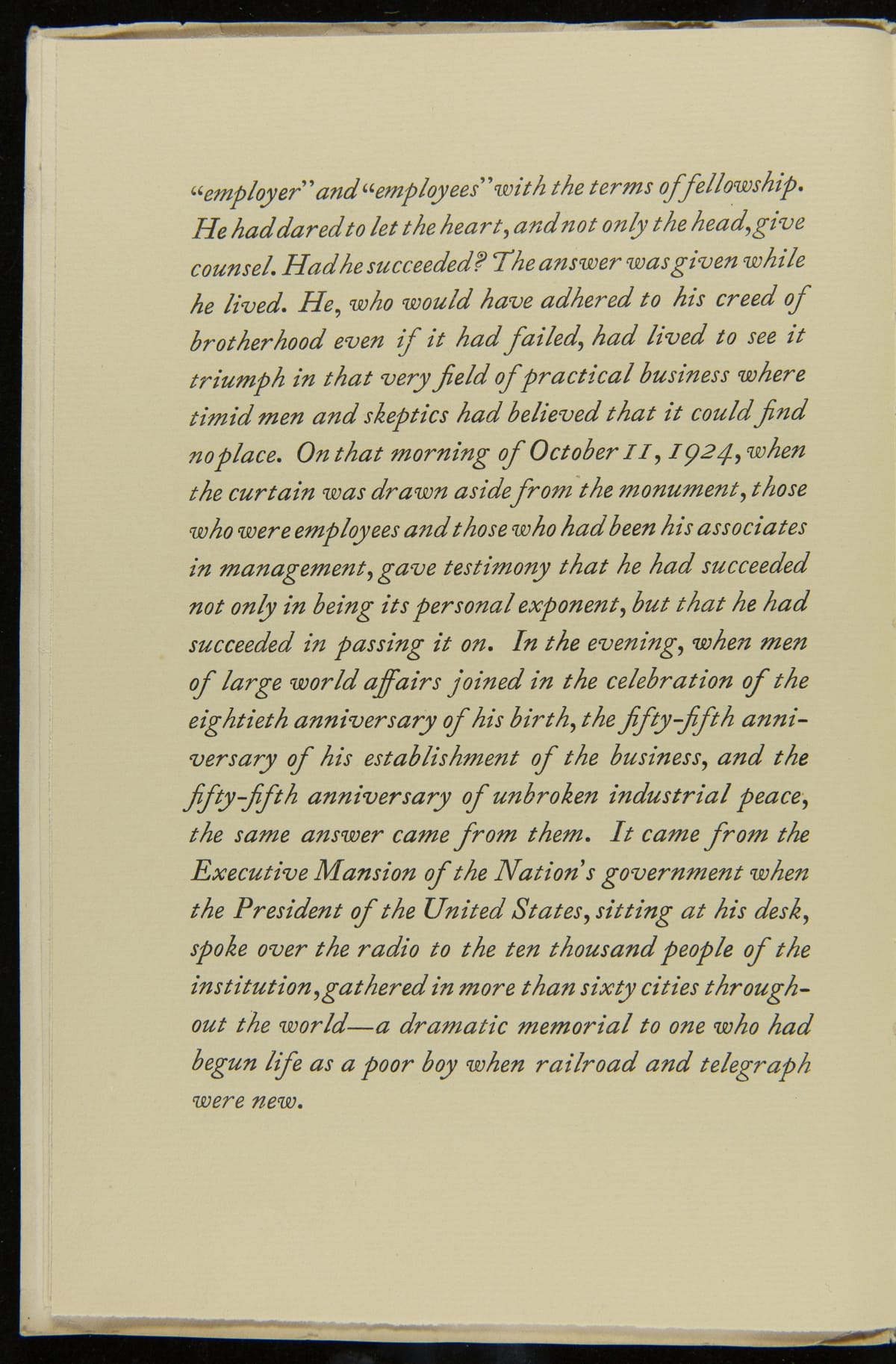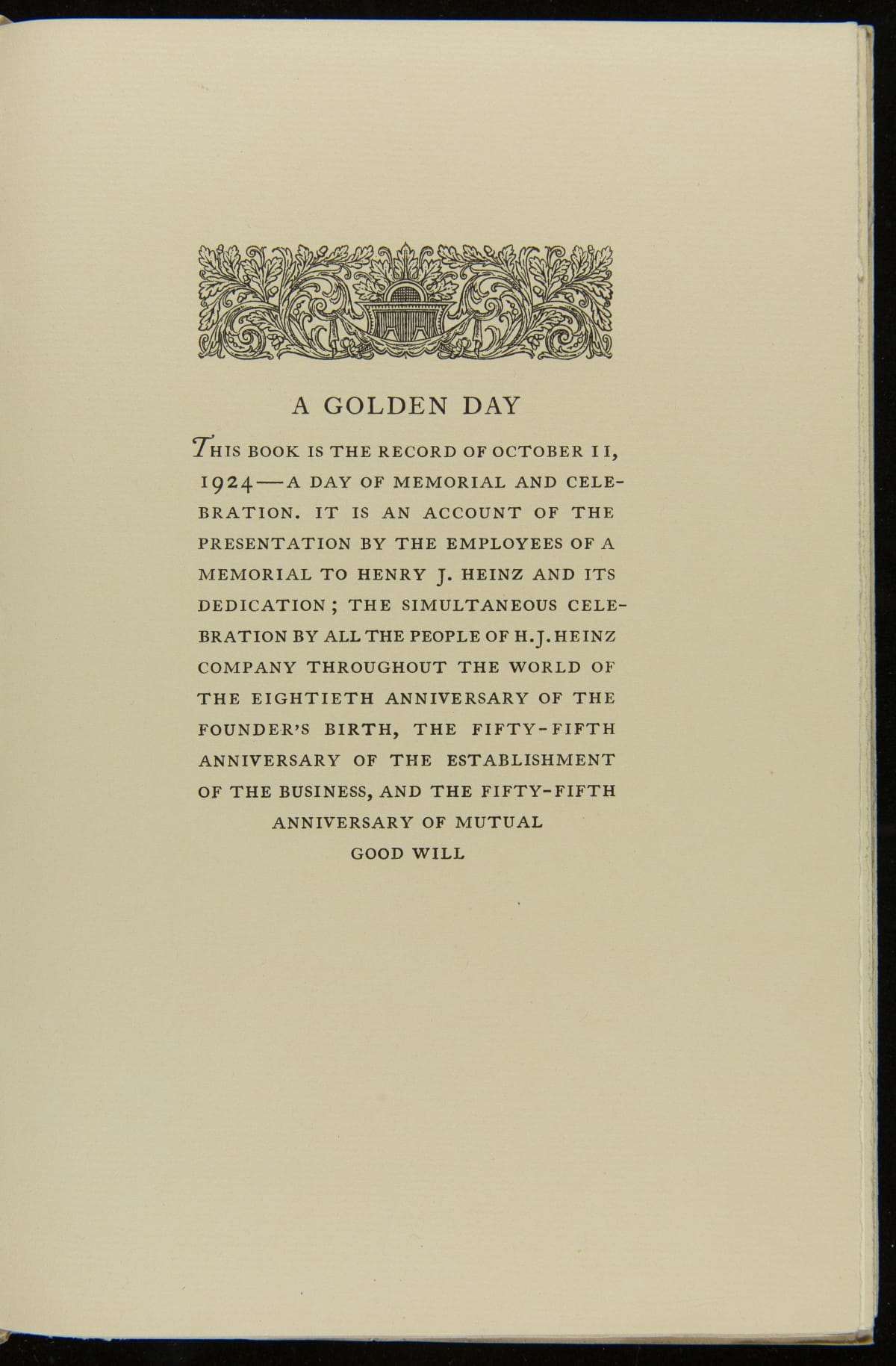 H.J. Heinz valued a strong relationship between his company and its employees. This resulted in a world-class employee welfare program which included amenities, programs, and policies with consideration for employees' well-being. In 1924, to commemorate the company's 55th anniversary, employees erected a memorial statue as a token of their gratitude for their employer. This is a program from the celebration, called "A Golden Day."