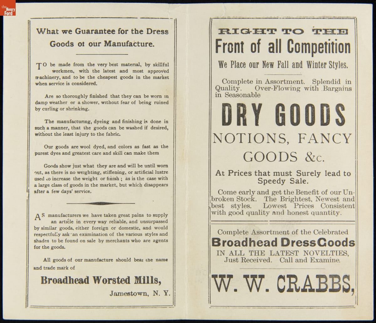 Manufactured by Broadhead Worsted Mills, Jamestown, New York. Retailed by W.W. Crabbs, Morenci, Michigan. Lithographed by G.H. Dunston, Buffalo, New York.