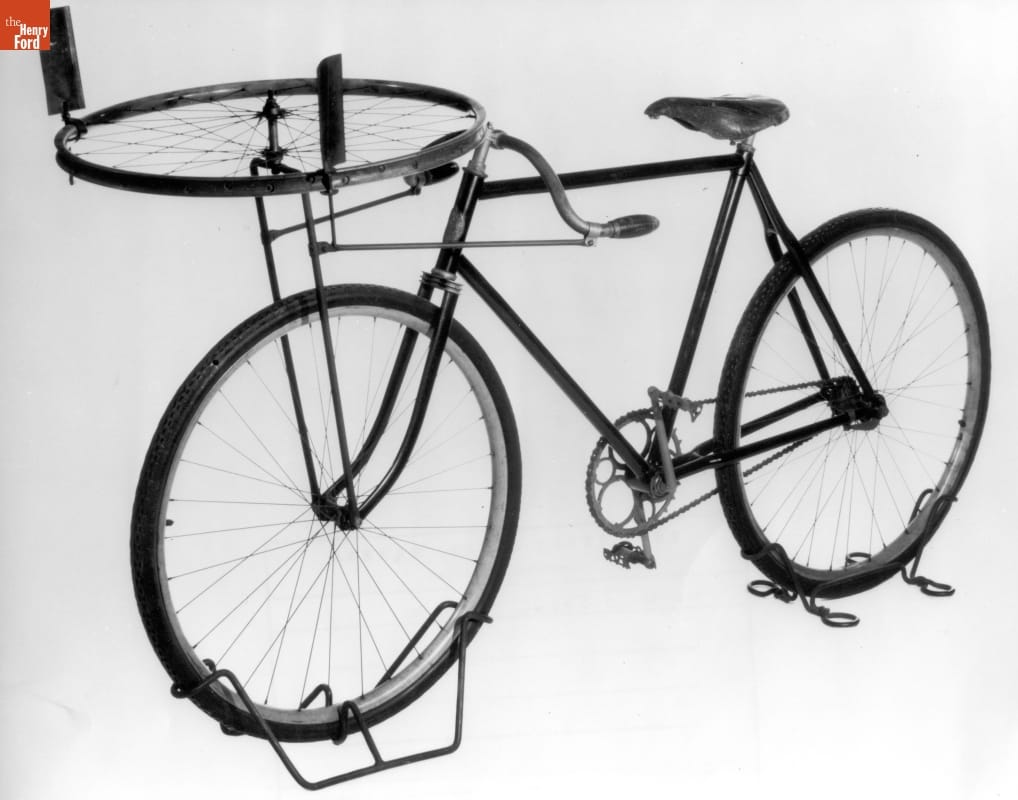 After their 1901 glider didn't perform as expected, Wilbur and Orville Wright modified a bicycle to test the data used to shape their wings. Riding the bike generated a breeze that simulated the air pressure against a wing in flight. Although this St. Clair bicycle was built by the Wrights, it is not the actual bike used in their experiments.