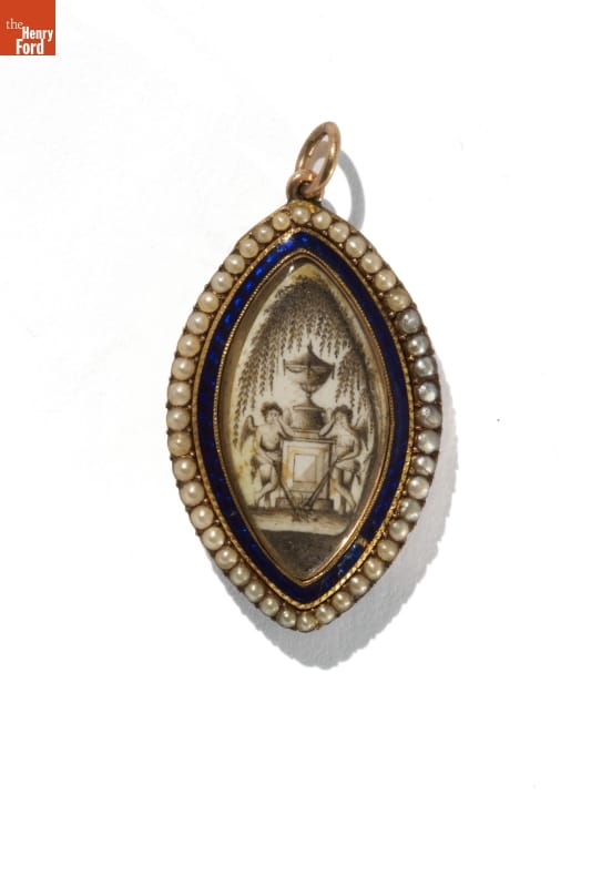 Before the 20th century, death came early and often. One way people coped was to wear jewelry as memorials to their loved ones. Over the centuries, mourning jewelry followed the prevailing fashions. Shortly after independence, Americans favored illuminated, miniature brooches and pendants painted on ivory. These featured shapes derived from classical design, symbols such as urns and weeping women dressed as ancient Romans.