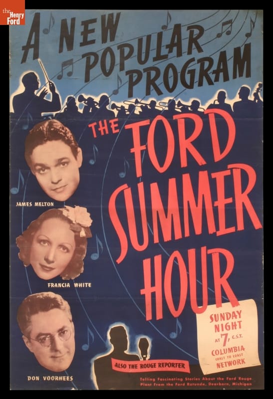 The Ford Summer Hour was a radio program produced from 1939 to 1941 by Ford Motor Company as a summer replacement for their regular Ford Sunday Evening Hour. The broadcast featured popular songs and tunes from musical comedies and operettas. Ford's sponsorship did not allow for commercials, but an intermission included talks on Ford-related subjects.