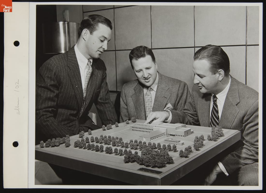William Clay Ford, Henry Ford II, and Benson Ford Viewing Model of Dynamometer Building, December 1949