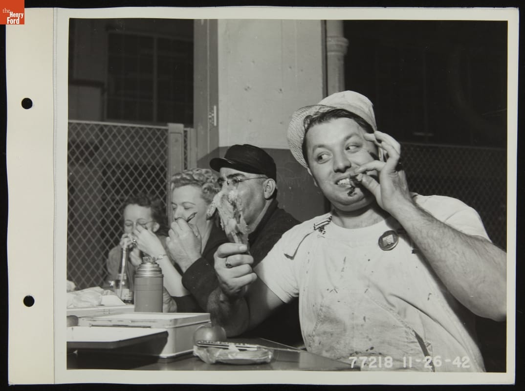 Ford Motor Company Employees Eat Thanksgiving Dinner on the Job at the Highland Park Plant, November 1942