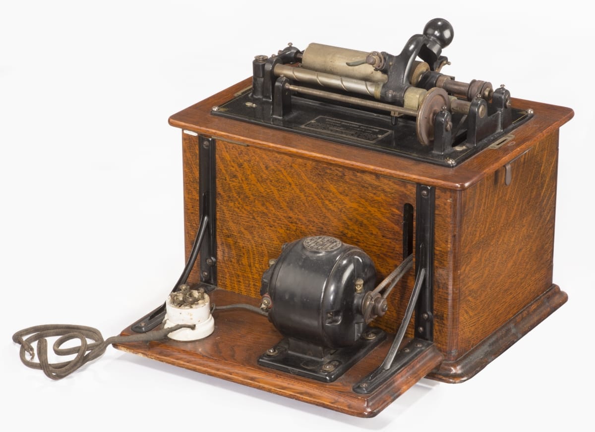 Dictaphones and Ediphones were sound recording devices largely used for oral dictation in business settings. In this scenario, wax cylinder recordings were passed to a secretary, who listened to the recording with a playback-only transcriber and then typed up notes. A shaving machine, such as this one, scraped the previously inscribed layer away allowing a wax cylinder to be reused over 100 times.
