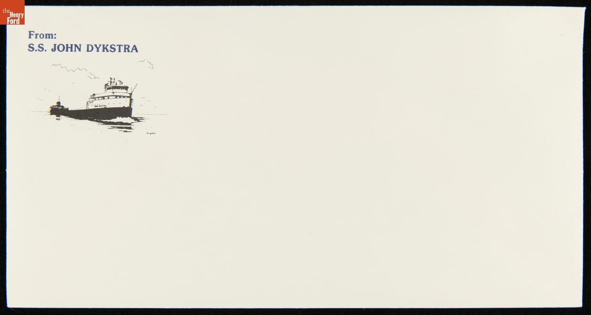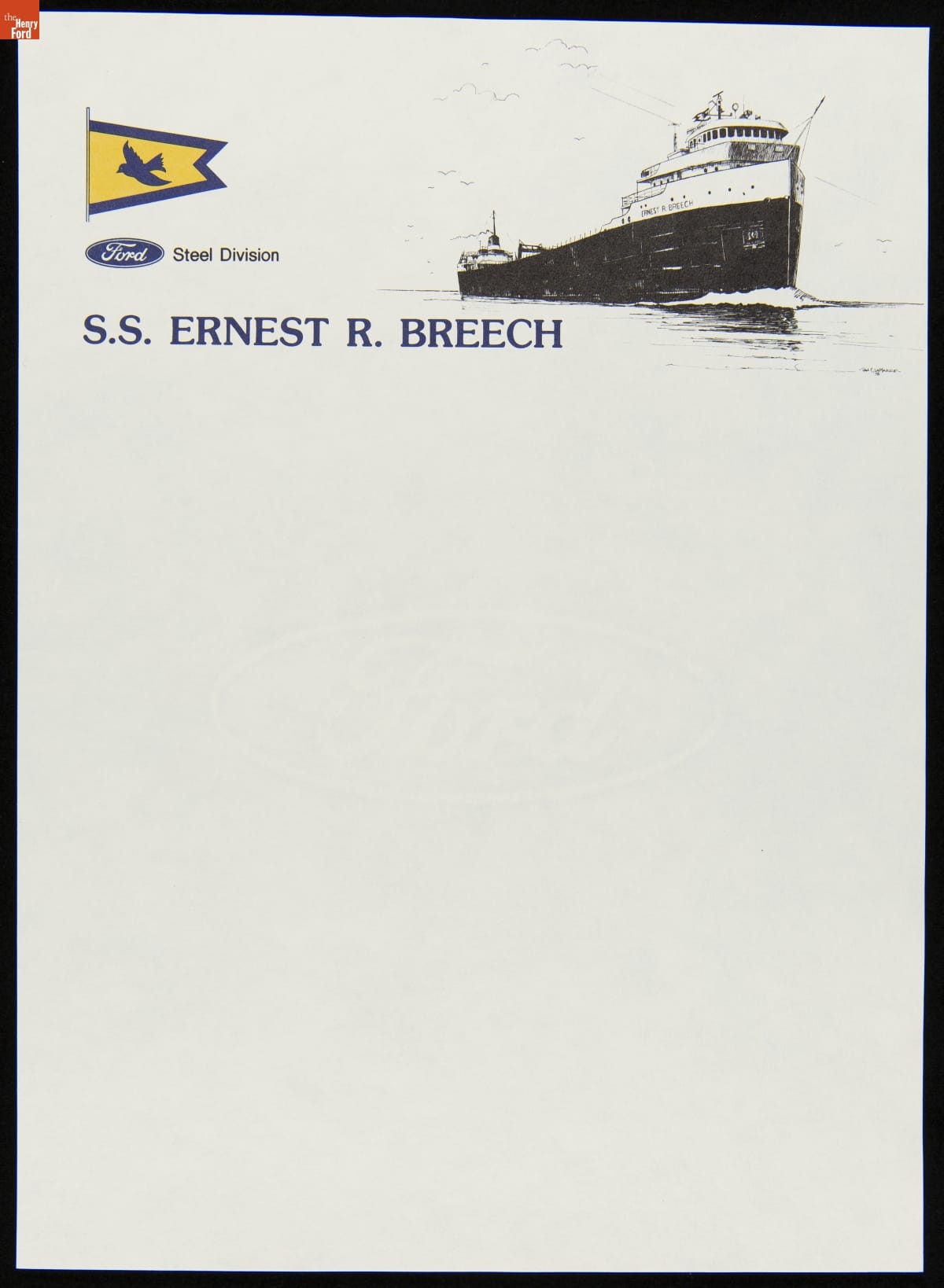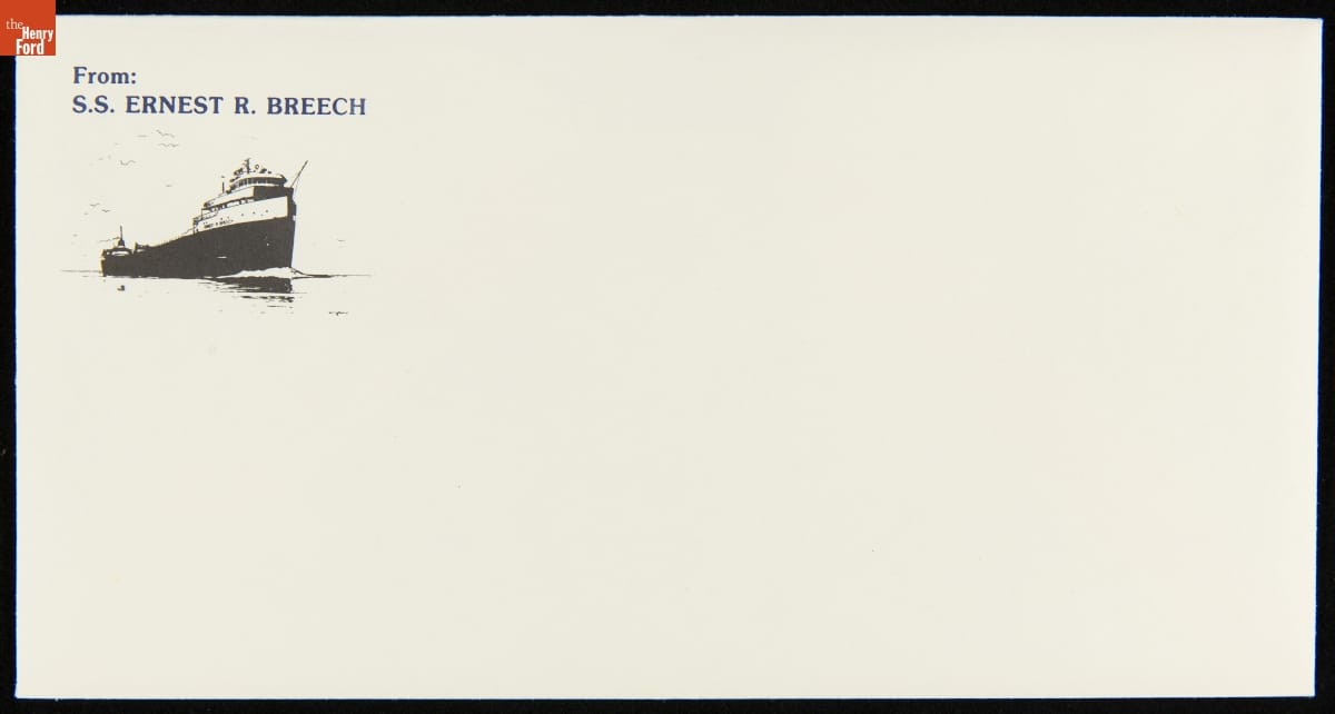 Stationery for the Ford Motor Company's ore carrier Ernest R. Breech contains images of the freighter, the Ford logo, and the house flag flown when the ship was underway. The flag depicts a bluebird -- a favorite of Henry Ford, an amateur birdwatcher. The Breech, named for a former board chairman at Ford, hauled raw material to Ford's River Rouge factory near Detroit, Michigan.