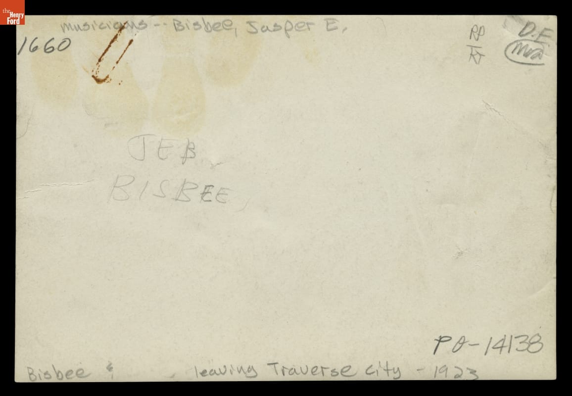 Eighty-year-old Jep Bisbee, a northern Michigan fiddler, and his wife Sarah left northern Michigan for Thomas Edison's New Jersey laboratory in November 1923. Henry Ford was much taken with Bisbee's playing and wanted Edison's company to record him. Ford even sent his personal railroad car to transport the Bisbees from Traverse City to New Jersey.