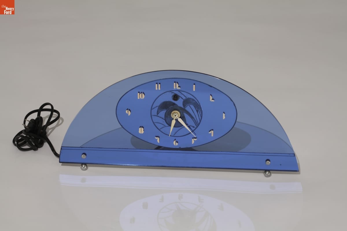 The General Electric Company made this simple yet elegant clock in 1936. Designers of this Art Moderne style clock employed color, simple lines and geometric shapes (the arc, oval and circle) and used old materials in new ways (blue mirrored glass forms the body of the clock). This clock could have decorated many modern Americans' homes in the 1930s.