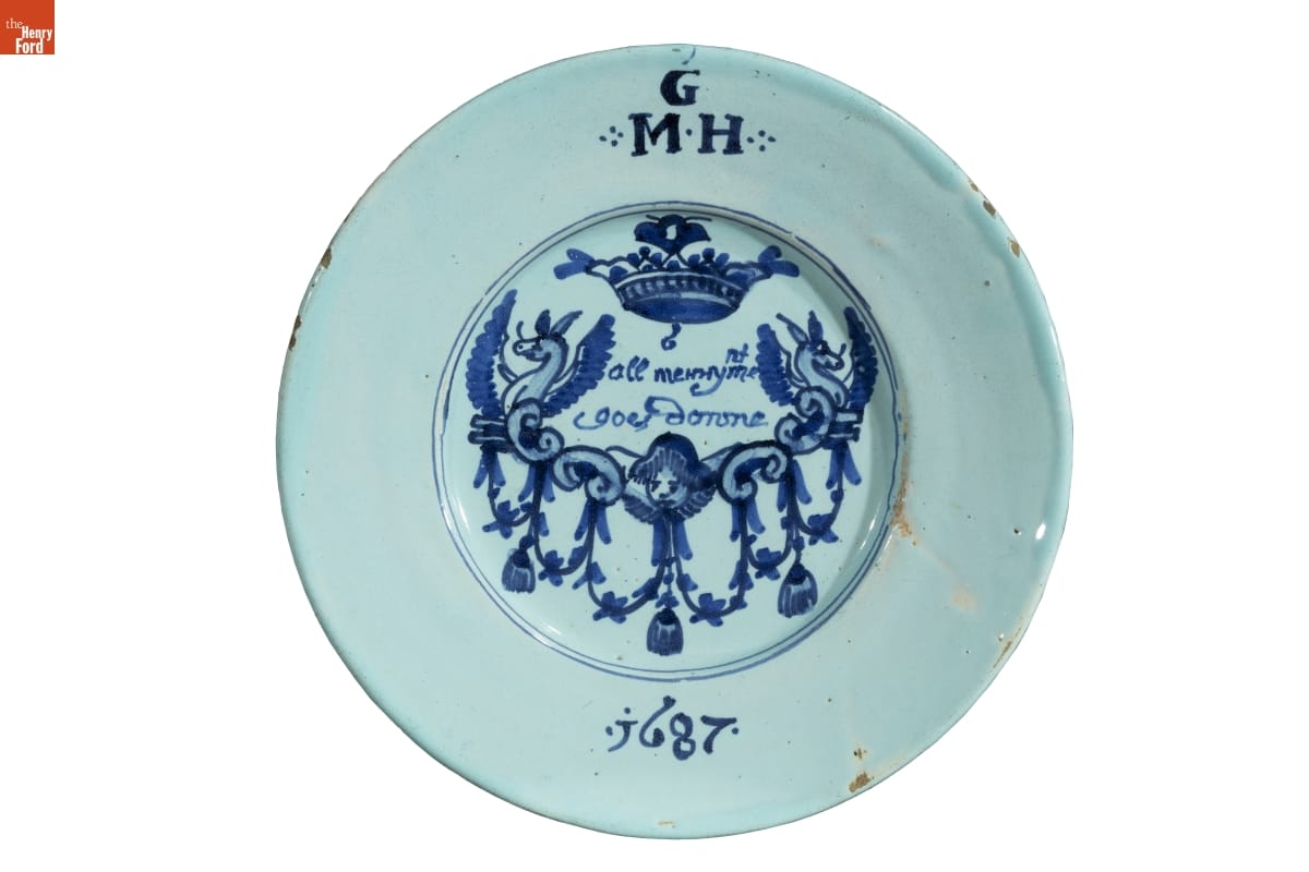 A well-to-do family in the late-17th century displayed decorated plates like this one on a table or in an open cupboard. The dishes, not used as common serving items, showed the owner's wealth and good taste. The plate's decorative motifs varied, but popular themes included: images of royalty, biblical stories, flowers, and may also have the owner's initials and a date.