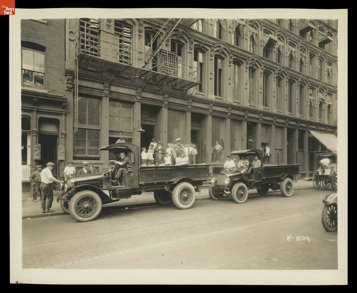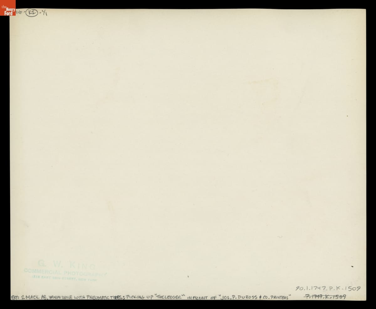 Two Mack Model AB Trucks with Worm Drives Parked in front of Jos. P Duross & Co. Printers, 1911-1916
