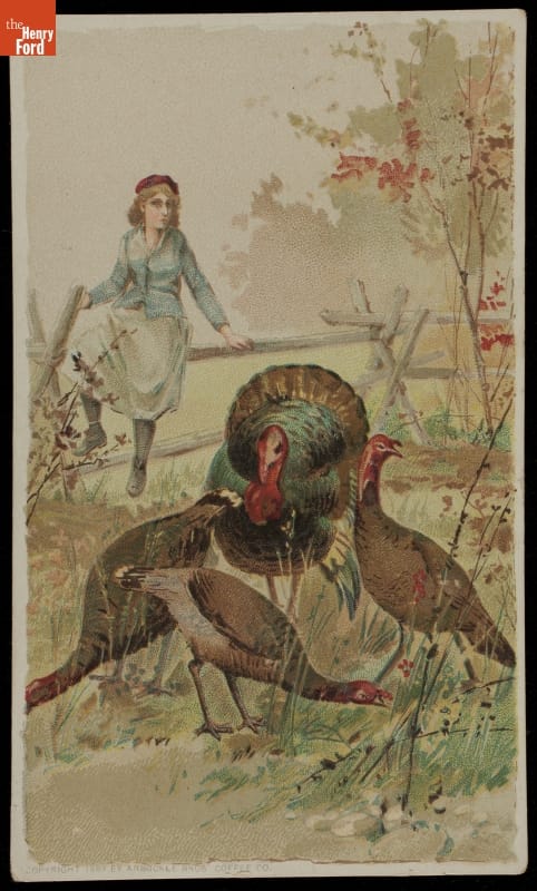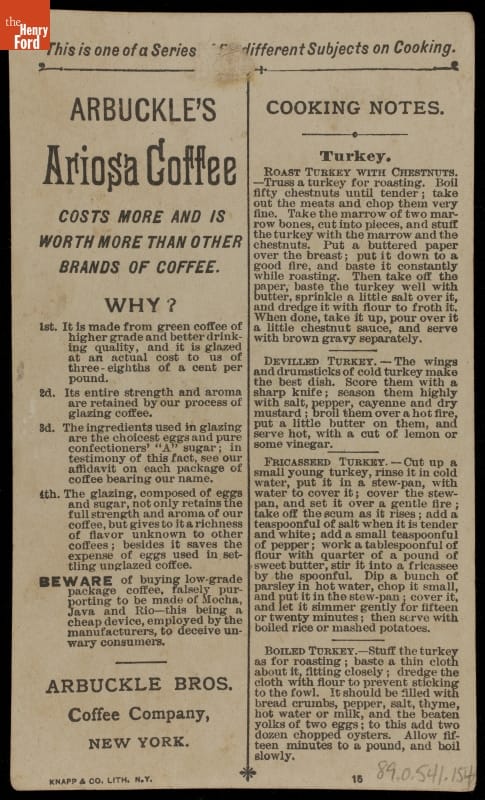 As color printing gained momentum in the late 19th century, trade cards were a major means of advertising goods and services. Americans enjoyed and often saved the vibrant little advertisements found in product packages or distributed by local merchants. This trade card for Arbuckle Bros. Coffee Company provides information about its Ariosa coffee, as well as cooking instructions for the animal featured on the front of the card.