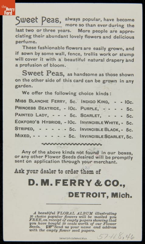 Advertisers used trade cards to sell goods and services and new color printing techniques increased their appeal during the late 19th century. Americans enjoyed and often saved the vibrant little advertisements added to product packages or distributed by local merchants. This trade card from D.M. Ferry & Co. features a colorful image of Sweet Pea flowers with additional educational information on the back.