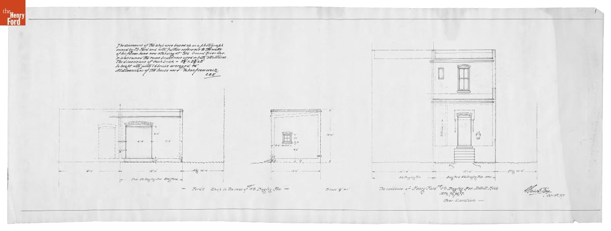 From late 1893 to mid-1897, Henry and Clara Ford rented the left half of a duplex at 58 Bagley Avenue in Detroit. Henry built his first automobile, the 1896 Quadricycle, in a shed behind the house. Charles Brady King drew this blueprint of the Bagley Avenue buildings in 1929, by which time the house was converted into a tea room.
