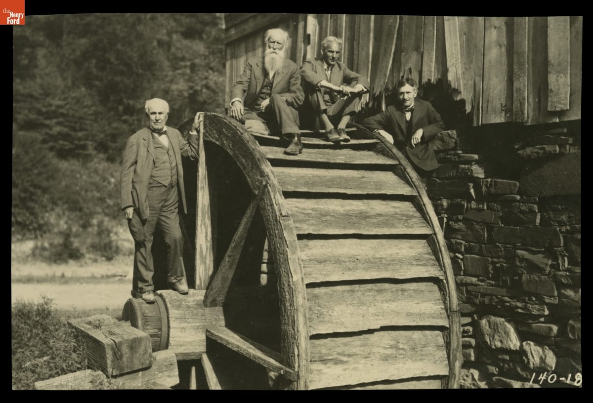 Thomas Edison, John Burroughs, Henry Ford, and Harvey Firestone pose on a waterwheel at old Evans Mill near Lead Mine, West Virginia. The photograph was taken in August 1918. The group called themselves Vagabonds and made a series of trips between 1916 and 1924. On these trips they communed with nature, explored their personal interests and acted like boys again.