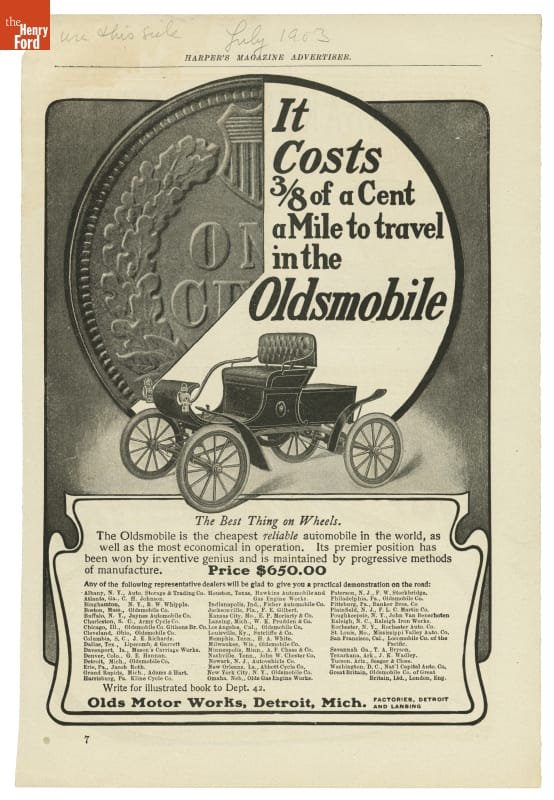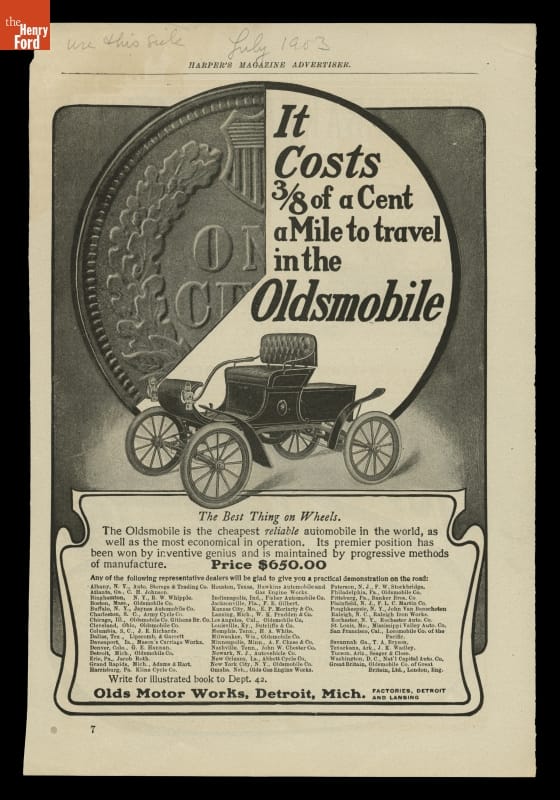 Ransom E. Olds wanted to manufacture inexpensive automobiles. This 1903 advertisement touts the curved dash Olds as the "cheapest reliable automobile in the world." His creation was the bestselling car in America from 1902 to 1905.