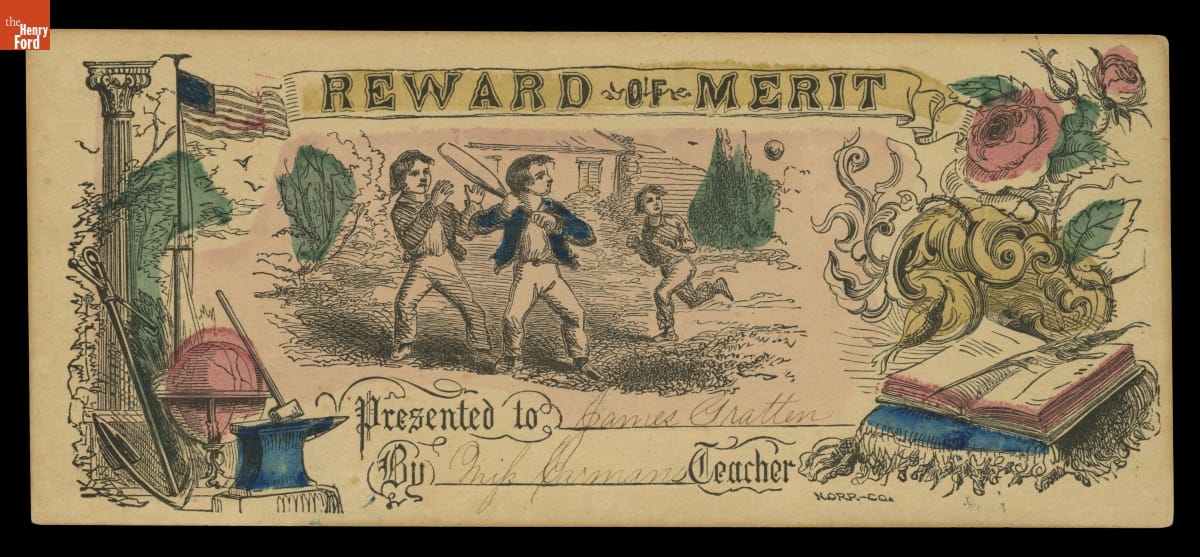 During the nineteenth century, teachers recognized students with "rewards of merit." These were generally printed and colorfully decorated papers with space available for names of the student and teacher. While the accomplishment of James Gratten is unknown, the image on the reward shows a bat and ball game in 1850s America. But is it baseball, rounders, townball, or just spontaneous schoolyard fun?