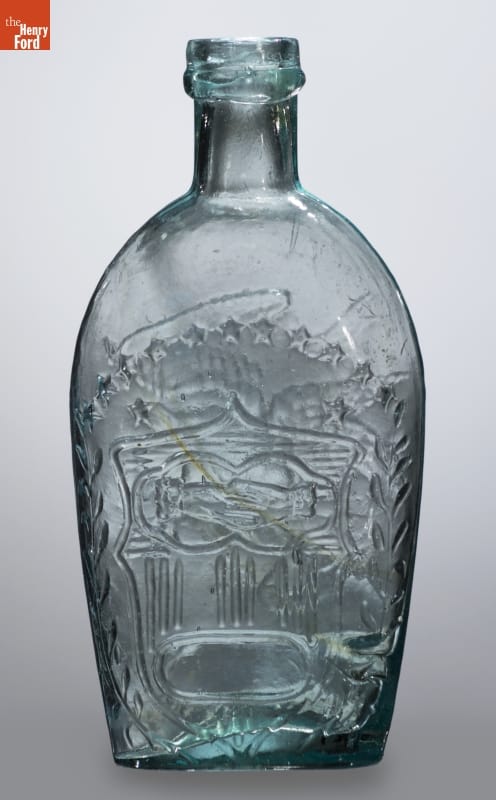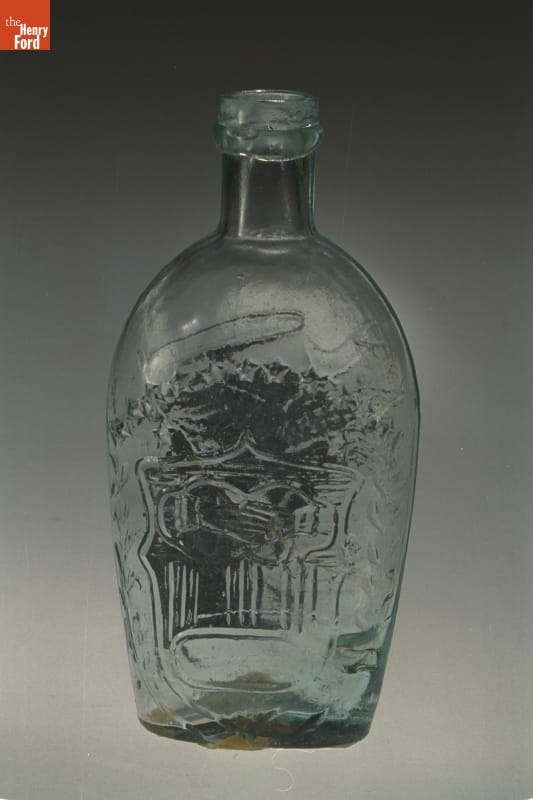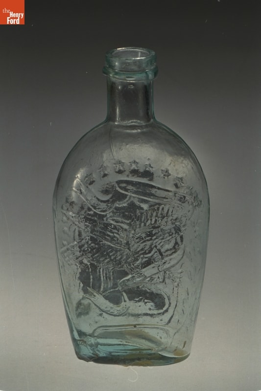 Glass factories in America began producing inexpensive, mold-formed flasks in the early 1800s. These figured flasks, often decorated with symbols of national pride or political or cultural affiliation, appealed to America's common man. The clasping hands, shield and eagle represent the Union -- a cause many Americans fought to uphold during the Civil War.